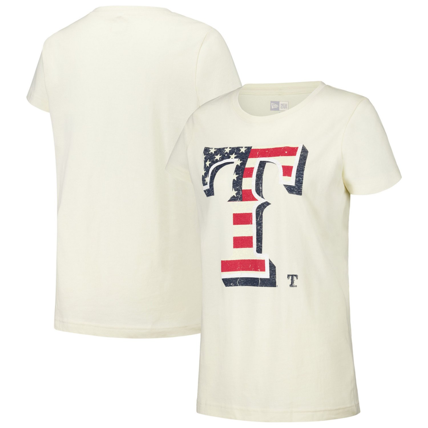 Express your pride in the USA during baseball season with this Texas Rangers Vintage T-shirt Made by New Era it features the Texas Rangers logo printed in an American flag design Soft durable cotton fabric provides continuous comfort