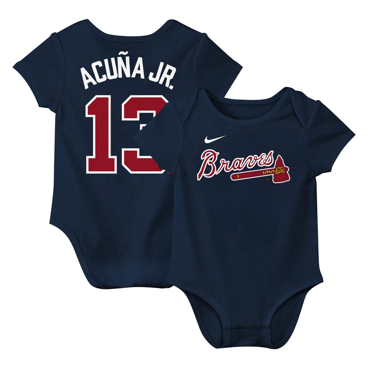 Nurture a love for Ronald Acua Jr with this Atlanta Braves Fuse Name and Number bodysuit Made by Nike it features team graphics printed on the front and Ronald Acua Jr details displayed down the back A lap shoulder neckline and snaps at the bottom help make dressing easier