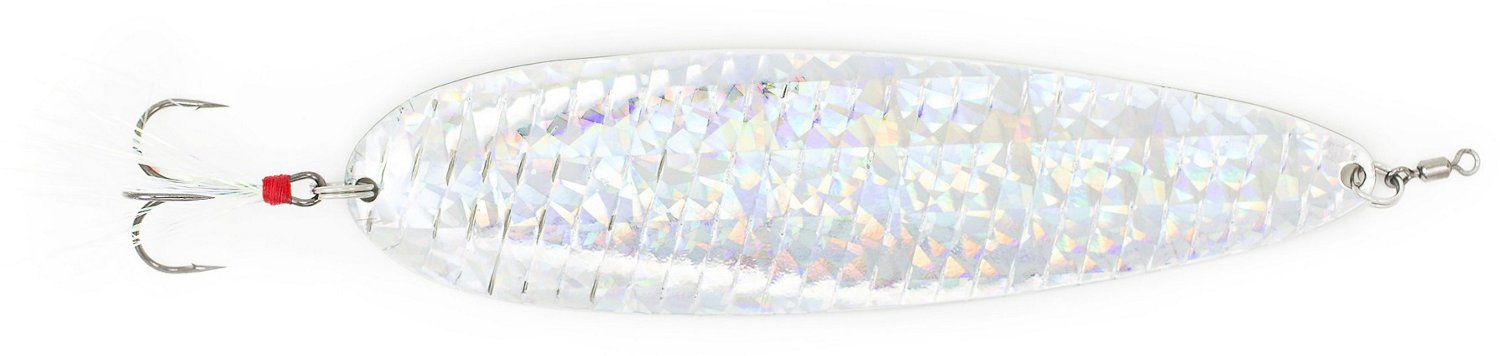 Complete with a treble-style hook, the Nichols Lures 8 in Ben Parker Magnum Spoon delivers premium fishing performance. In addition to its beautiful finish, it also features a pearl flashabou to attract your next catch. 3.5 ounces. Hook size: 3/0.