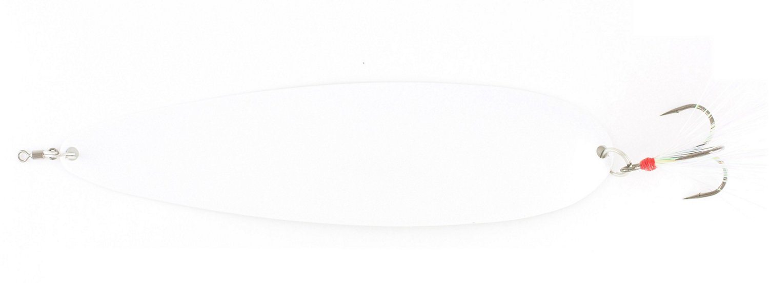 Complete with a treble-style hook, the Nichols Lures 8 in Ben Parker Magnum Spoon delivers premium fishing performance. In addition to its beautiful finish, it also features a pearl flashabou to attract your next catch. 3.5 ounces. Hook size: 3/0.
