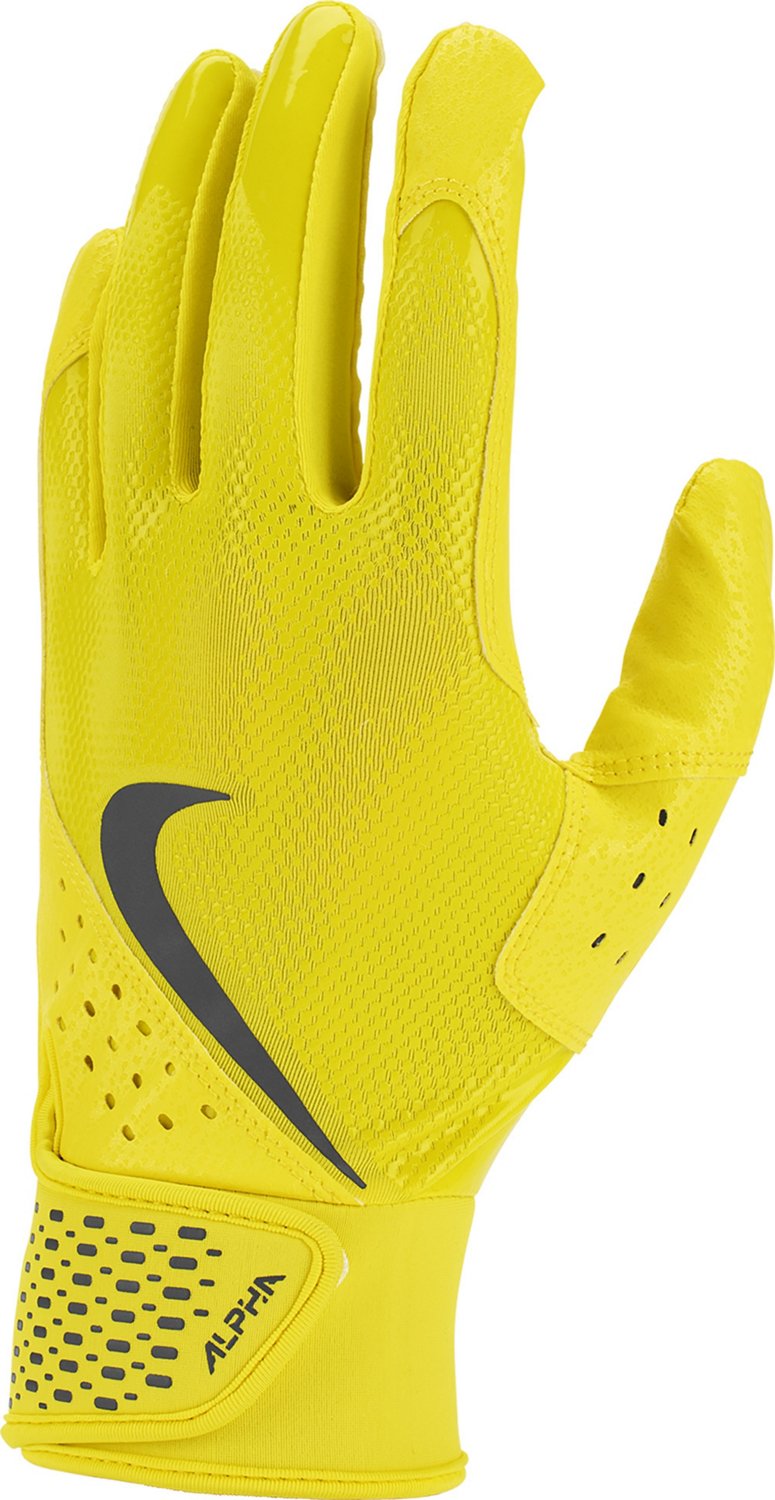 Hit the field in style with Nike Adult Alpha Batting Gloves. The gloves are made from PU leather, spandex, neoprene, nylon, and polyester materials that are made to last, and the gloves’ neoprene cuff provides a lockdown fit.