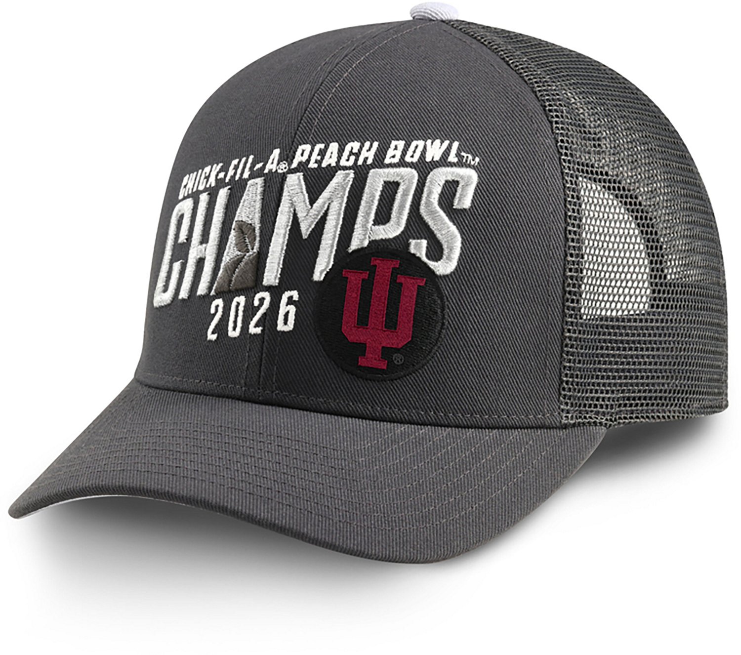 The Nike Adult's Indiana 2025 Peach Bowl Champions Locker Room Trucker Cap is the official headwear worn by the Hoosiers during their post-game trophy celebration, featuring bold championship graphics and raised embroidery that proudly displays Indiana's status as bowl game winners. Designed with breathable mesh panels and a structured front for a classic, comfortable fit, this cap includes an adjustable snapback closure to ensure it fits any fan looking to represent the Hoosiers’ historic postseason victory.