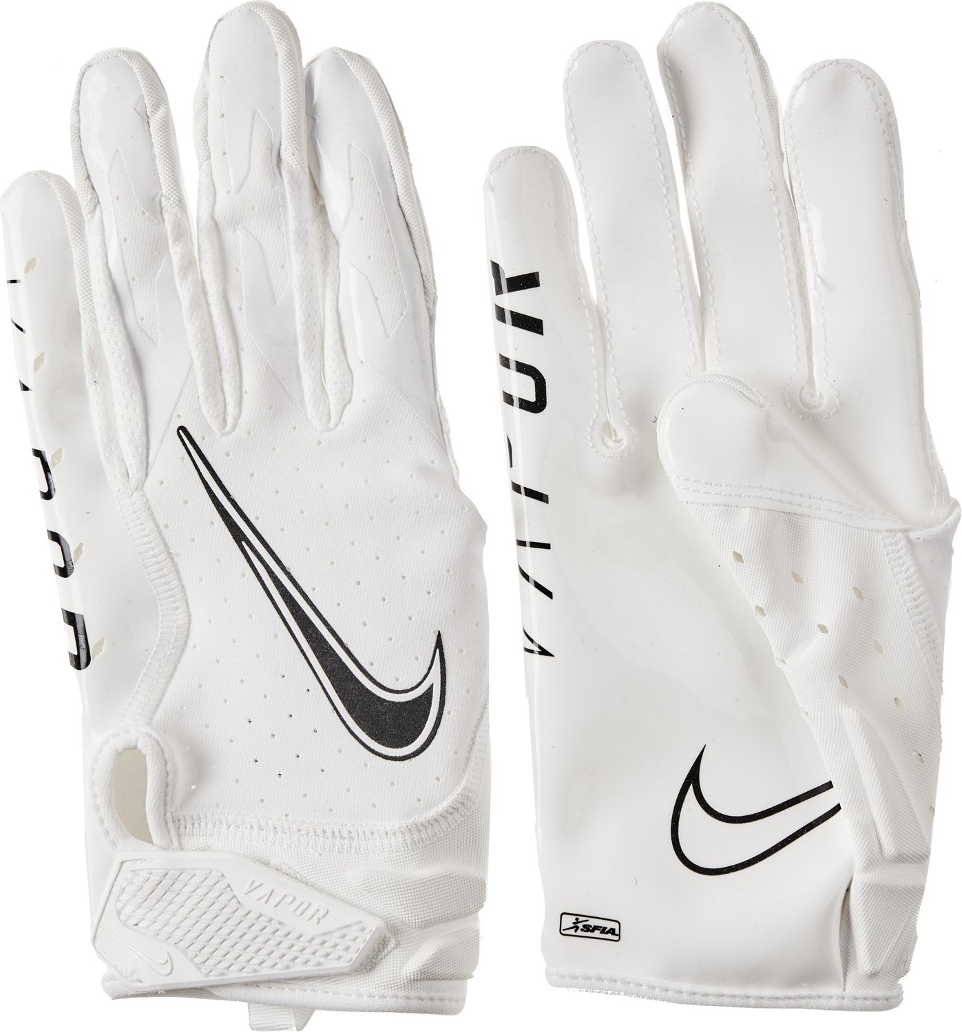 Make the play with the Nike Adults' Vapor Jet 6.0 Football Gloves. Constructed with a blend of durable materials, these football gloves provide breathable comfort, while the sticky Magnigrip palms offer improved grip. The lightweight thumb padding absorbs impact for increased protection, and the adjustable cuffs ensure a customized fit.