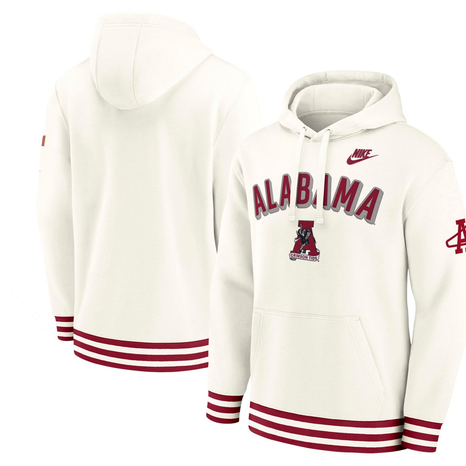 Stay warm in throwback style with this Alabama Crimson Tide Legacy Retro Pullover Hoodie by Nike Embroidered appliques and rib-knit trim add vintage touches to the modern design Dropped shoulders provide plenty of room for comfortable movement while cozy fleece fabric keeps you comfy in this classic Alabama Crimson Tide hoodie