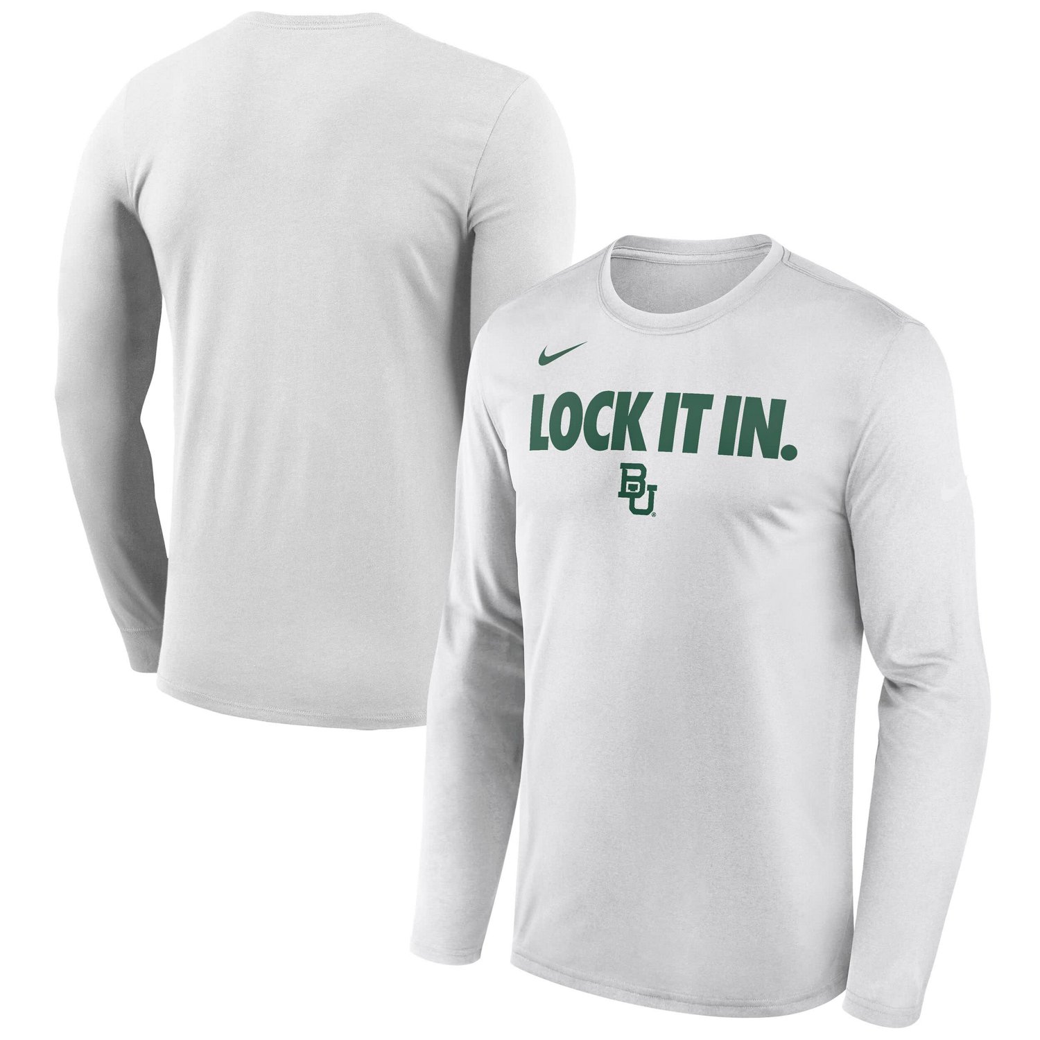 Dribble past the competition in this Baylor Bears On-Court Bench Long Sleeve T-Shirt from Nike Matching what the players on the bench will wear during the 2026 NCAA Basketball season this tee features a "Lock It In" wordmark across the chest with the Baylor Bears logo underneath With Dri-FIT technology to wick away sweat and a lightweight breathable build you'll be able to hit the gym or enjoy even the most intense matches while staying cool and comfortable
