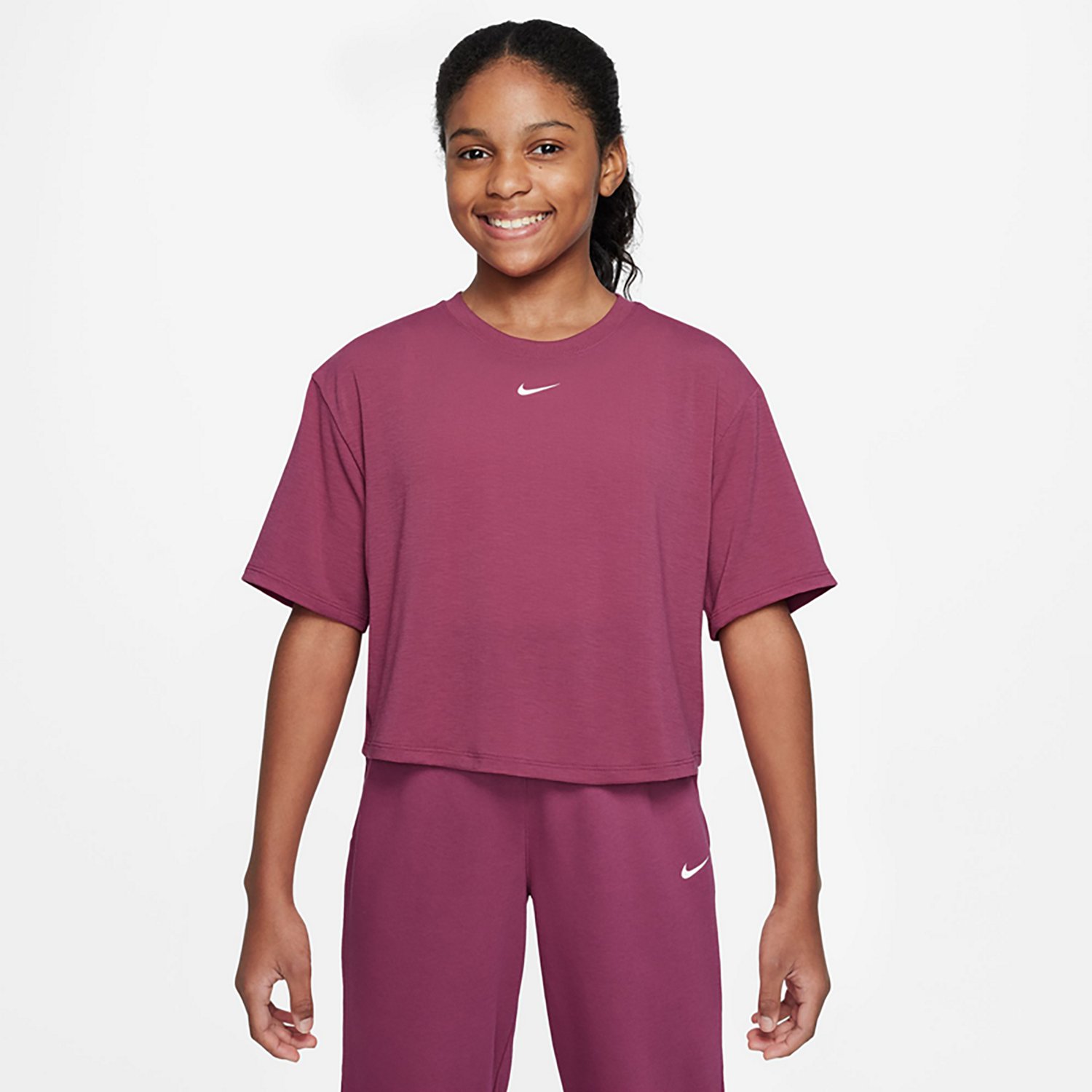 Stay dry and comfortable throughout the day with this Nike Girls' One Relaxed Dri-FIT One Loose Short Sleeve Top. It is made of 81% polyester, 13% cotton and 6% spandex for flexible comfort, and Dri-FIT technology works to wick sweat and dry quickly.
