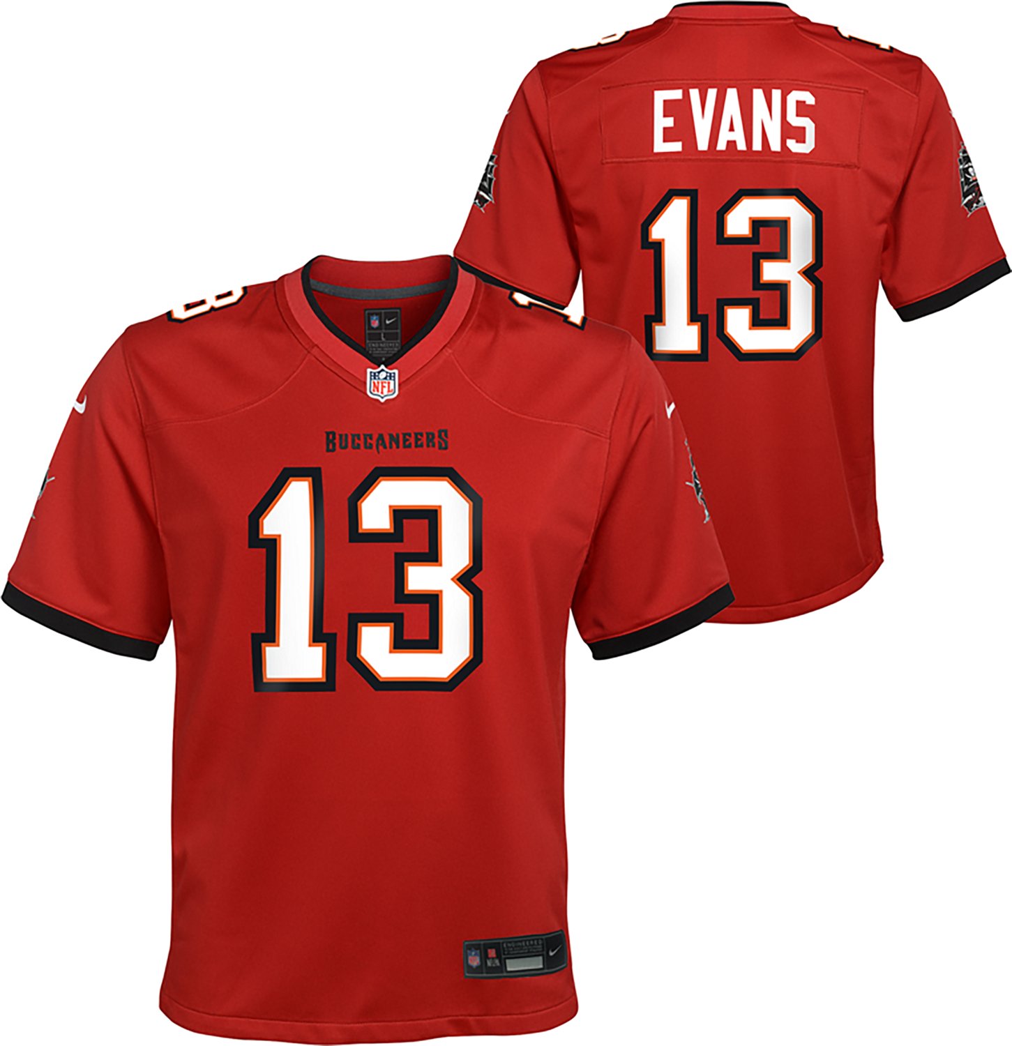 Cheer on the Buccaneers in style wearing the Nike Boys’ Tampa Bay Buccaneers Mike Evans Primary Game Player N&N Jersey. It’s made from 100% polyester for durable comfort, and Mike Evans’s number is displayed prominently on the front and back to show off your fandom.