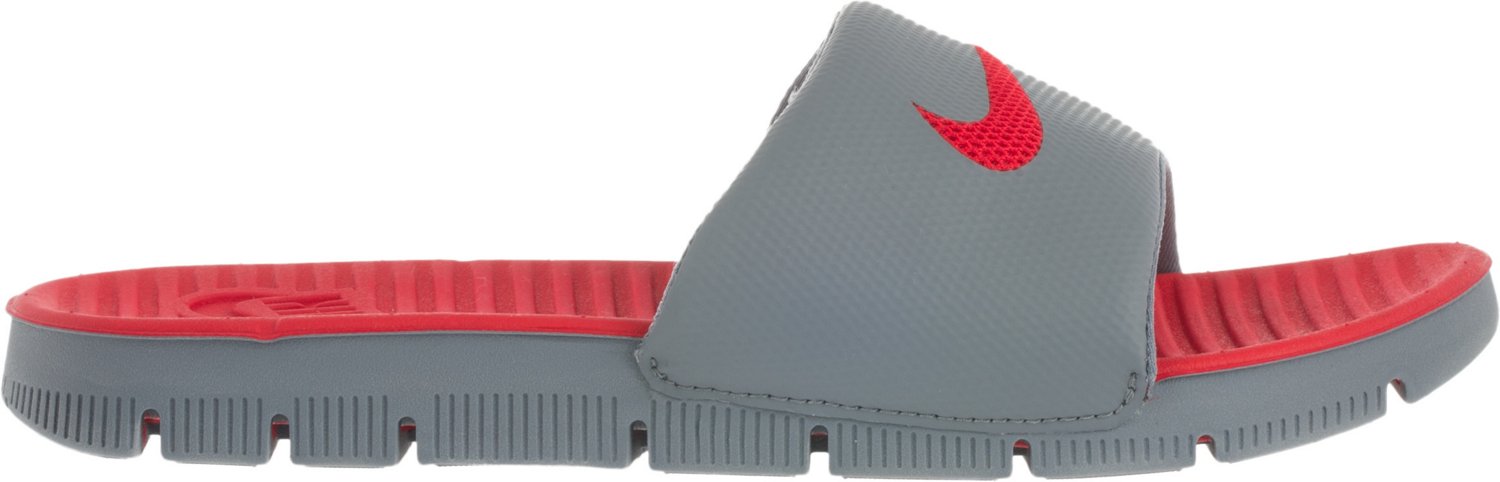 Stay comfortable in the Nike™ Boys' Benassi Flex Motion Sport Slides, which feature reengineered, no-sew synthetic leather uppers and flex grooves that offer a natural range of motion. Hard-durometer Solarsoft foam outsoles provide durability, traction and stability, while soft, pliable Solarsoft foam midsoles with built-in grooves offer cushioning and support. Slip-on style.