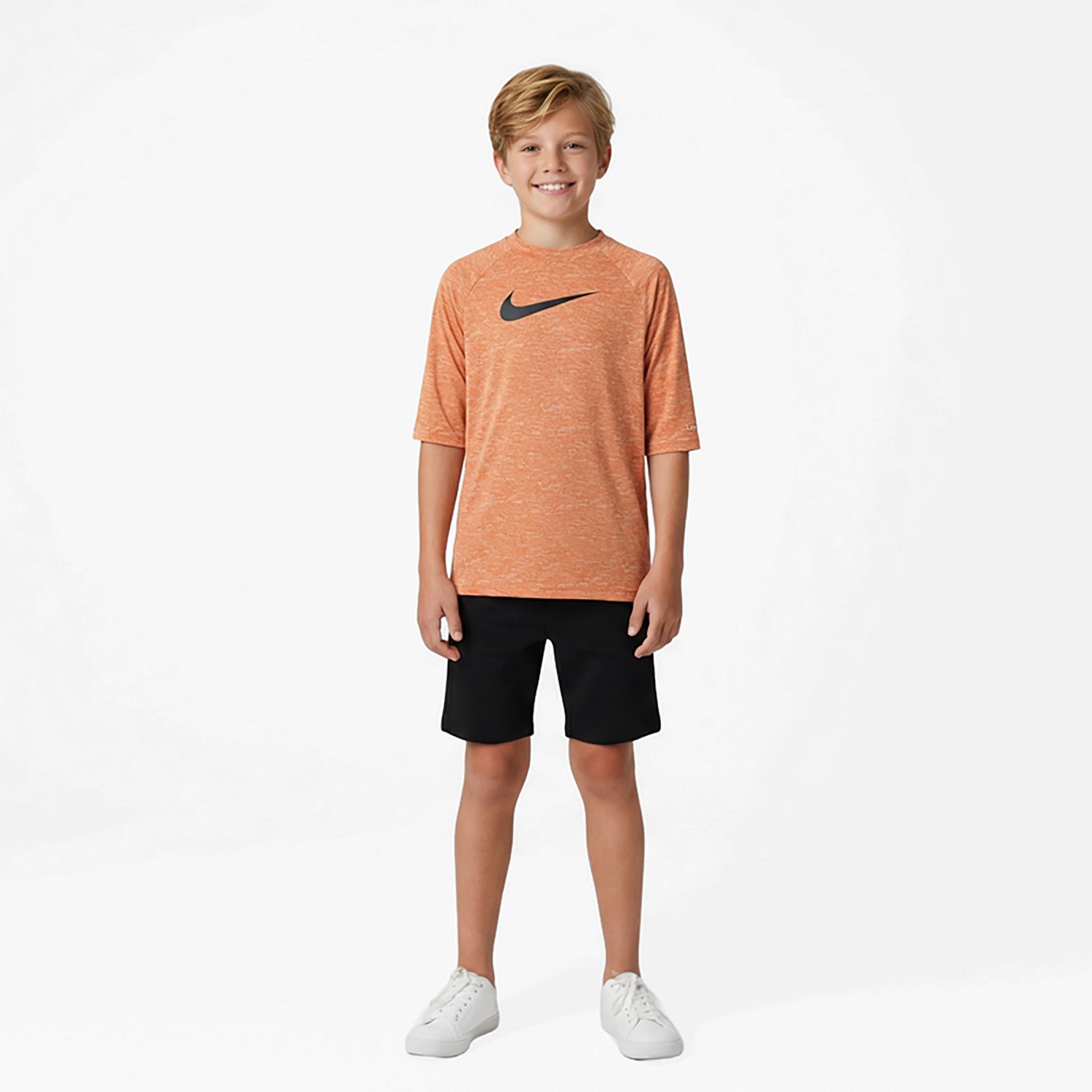 Swim your heart out in the Nike Boys' Heather Short Sleeve Hydroguard Rash Guard. The fabric is designed with UPF 40+ sun protection to help keep you safe from harmful rays, and the Dri-FIT technology provides moisture management. The internal neck tape provides a soft feel.