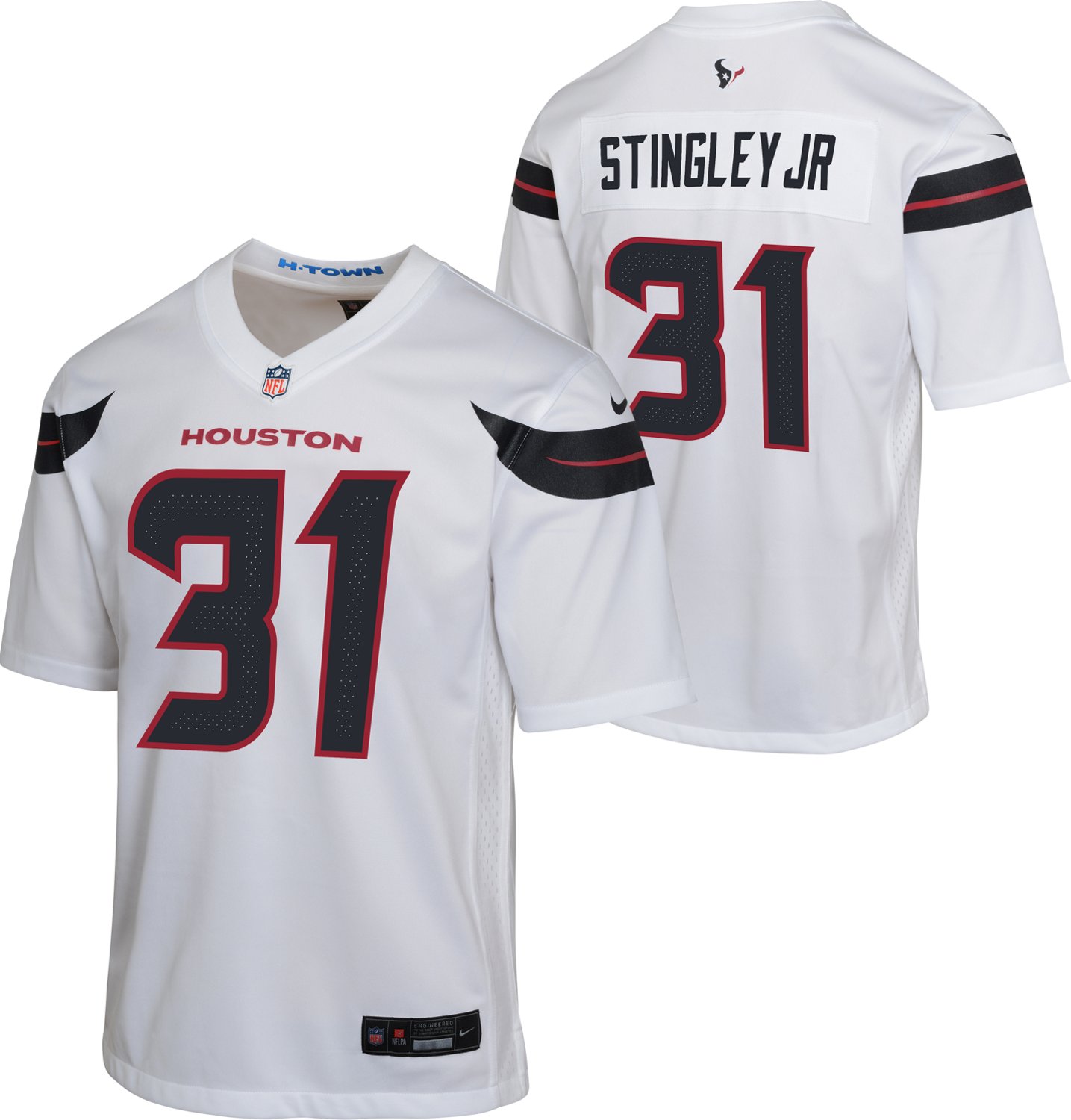 Support running back Dameon Pierce with the Nike Men's Houston Texans Dameon Pierce #31 Away Jersey. Crafted from 100% polyester with screen-printed graphics, this jersey delivers a lightweight, comfortable fit for cheering on the Texans, whether you're watching live or from home. Show your Texans pride and rep your favorite player with this essential game-day gear.