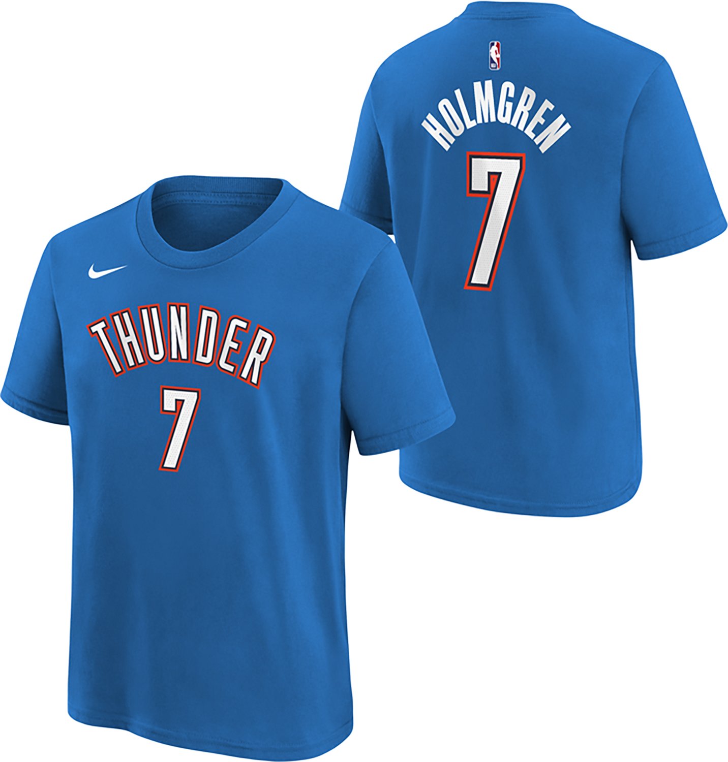 Recognize your favorite NBA player with the Nike Boys' Oklahoma City Thunder Chet Holmgren Icon N&N T-shirt. The cotton material is soft and comfortable for all-day wear, while the "Thunder" graphic and the number 7 and Holmgren wordmark display your fandom.