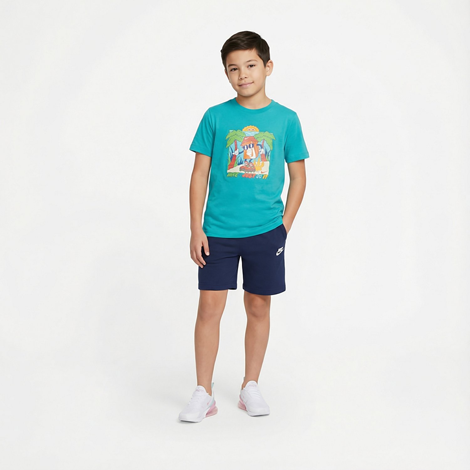 Be the coolest kid in school with the Nike Boys' Sportswear Short Sleeve T-shirt. It is made of 100% cotton. The graphic is printed on the front, and its classic fit that gives you plenty of space to move through your day. The short sleeves finish off the design.