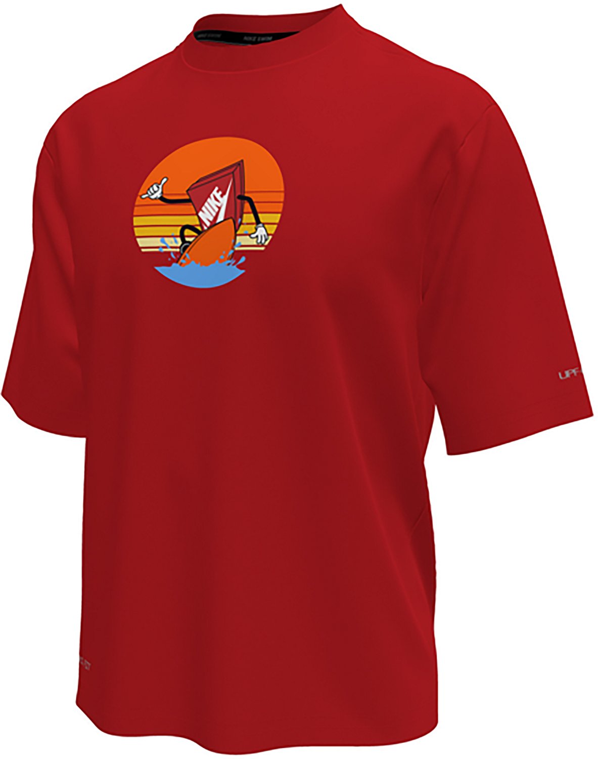 Splash around in the Nike Boys' Sunset Surf Short Sleeve Hydroguard Swim Shirt. It is made of 100% polyester. The Dri-FIT technology keeps you dry, and its UPF 40 UV protection helps you stay protected from the sun. The Swoosh on the back finishes off the design.