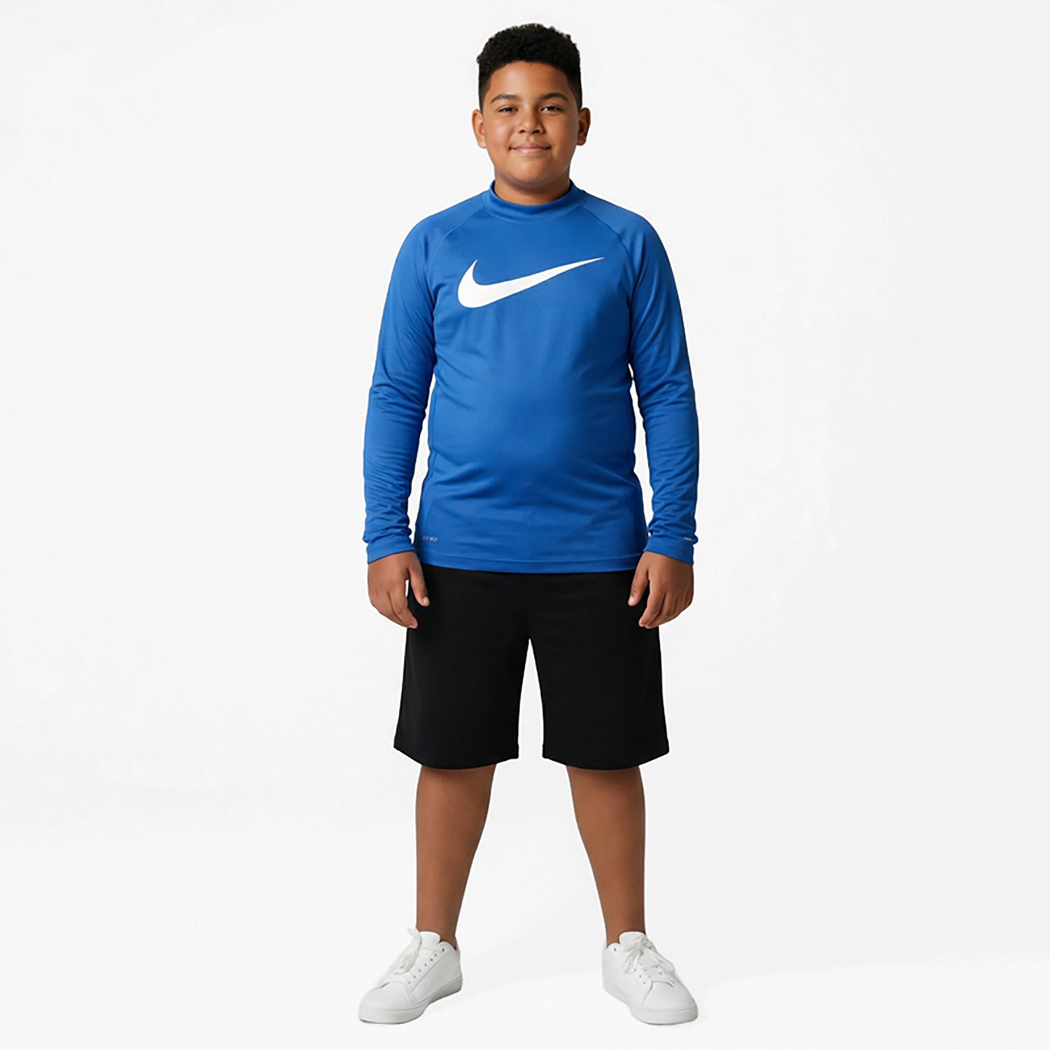 Showcase your love for Nike as you swim in the Nike Boys' Swim Multi-Logo Long Sleeve Hydroguard. The Dri-FIT technology gets rid of moisture to help you feel cool, and the 100% polyester construction withstands wear and tear. The crew neck with internal neck tape prevents irritation, and the multi-logo design highlights an eye-catching appearance.
