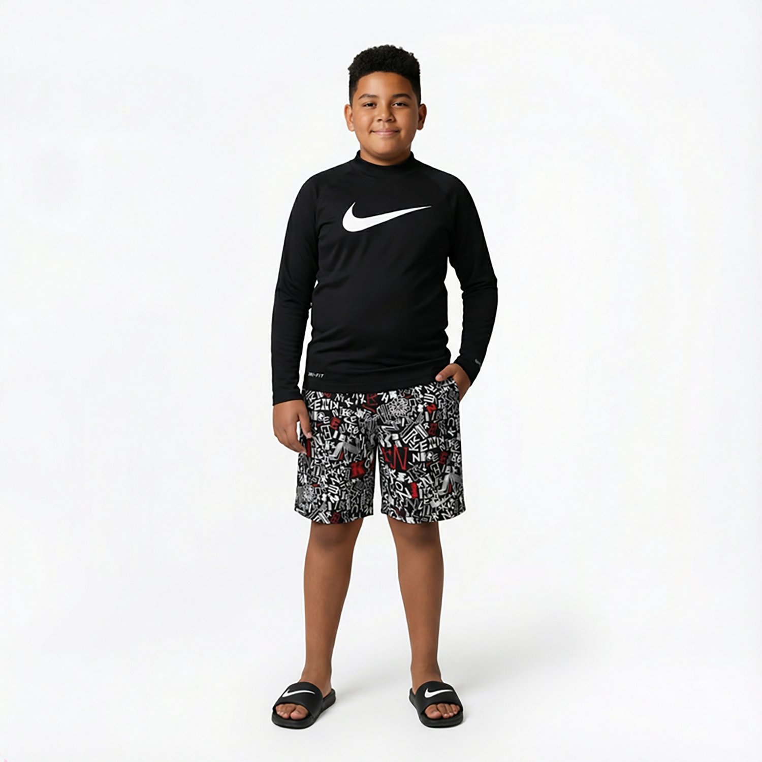 Showcase your love for Nike as you swim in the Nike Boys' Swim Multi-Logo Long Sleeve Hydroguard. The Dri-FIT technology gets rid of moisture to help you feel cool, and the 100% polyester construction withstands wear and tear. The crew neck with internal neck tape prevents irritation, and the multi-logo design highlights an eye-catching appearance.