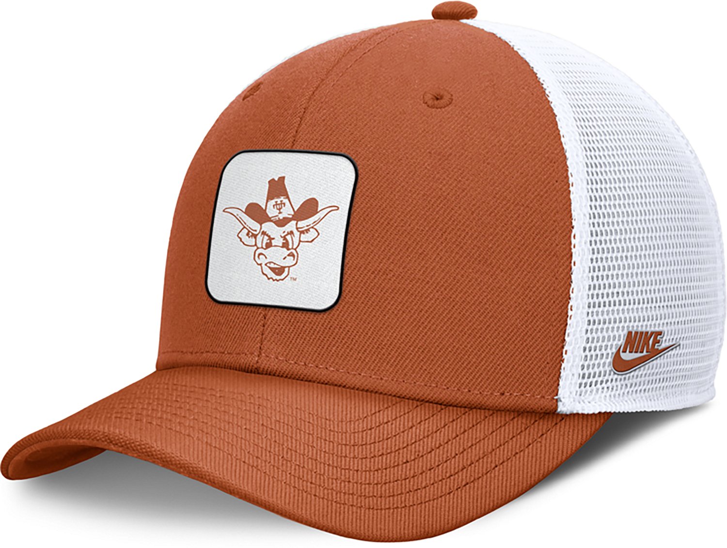 Show off your Texas Longhorns spirit with this Legacy Rise Mascot Trucker Adjustable hat from Nike This cap features a roomy high-depth design that's perfect for both sport and style The embroidered throwback team patch across the front panels adds a touch of classic flair while the four mesh mid and rear panels provide a breezy feel ensuring you stay cool and comfortable all day long This hat offers a comfortable and structured fit with a mid crown making it an ideal choice for any Texas Longhorns fan