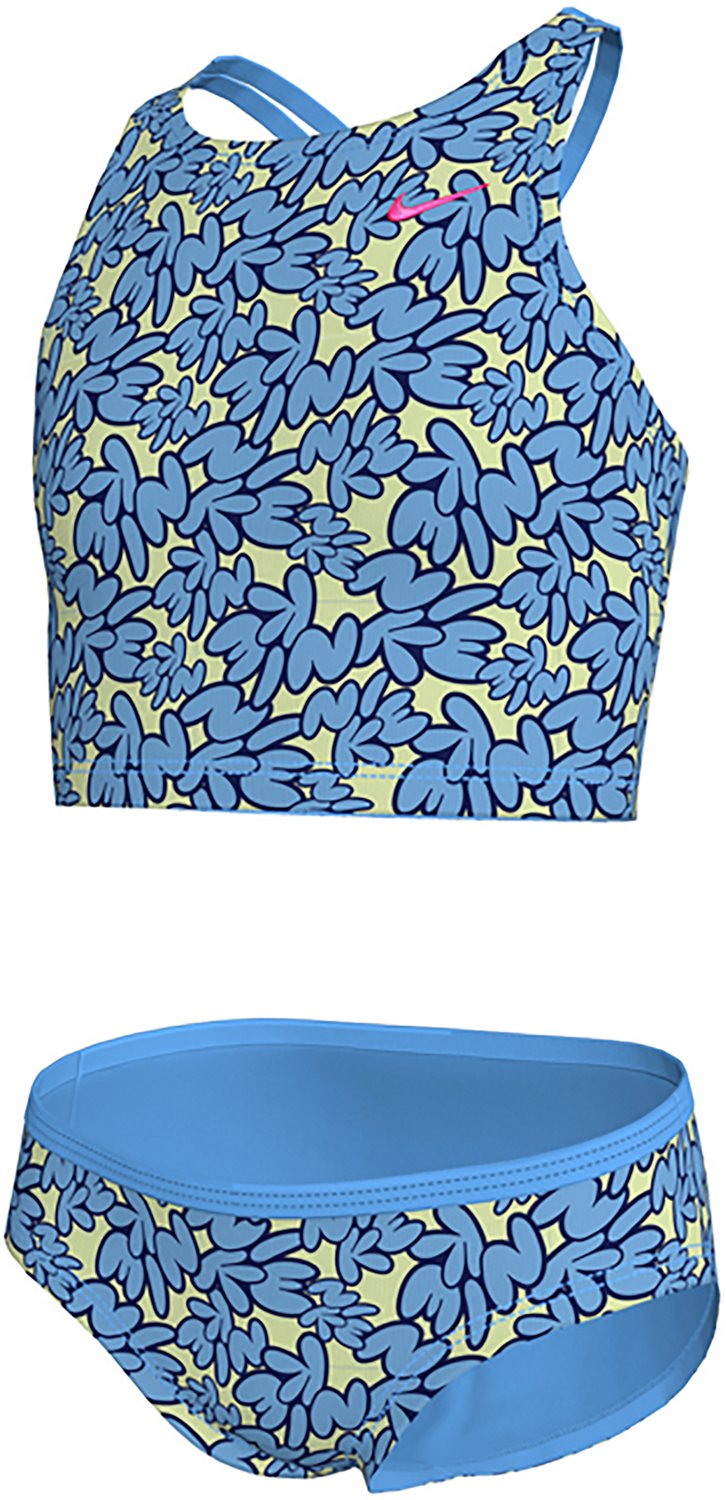 She'll exude confidence in the pool and at the beach in the Nike Girls' Bubble Script Spiderback Midkini Swim Set. This fun two-piece swimsuit is made of a stretchy nylon blend that won't weigh her down and a polyester lining to keep her covered. The fun bubble script creates an iconic look, while the crossback top and standard-cut bottom let her play and swim freely.
