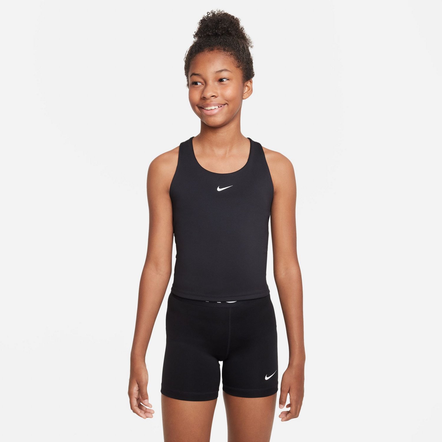 Your child will feel confident doing any activity with the Nike Girls' DF Swoosh Tank Sports Bra. The 83% polyester and 17% spandex body construction offers a stretchy feel that lasts, and the Dri-FIT technology helps keep your dry. The 2 layers of fabric deliver coverage and support across the chest, and the racerback design allows for optimal range of movement.