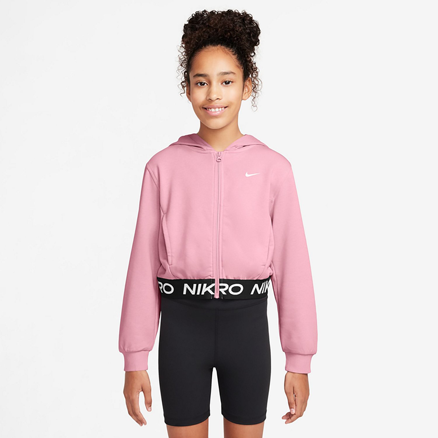 Reach for the Nike Girls' Dri-FIT Fleece Hoodie to look and feel great throughout the day. This hoodie is made of 62% cotton and 38% polyester with Dri-FIT fabric technology to help keep you cool, dry and comfortable, and the pockets make it easy to keep important items with you. The elastic waistband provides a snug fit.