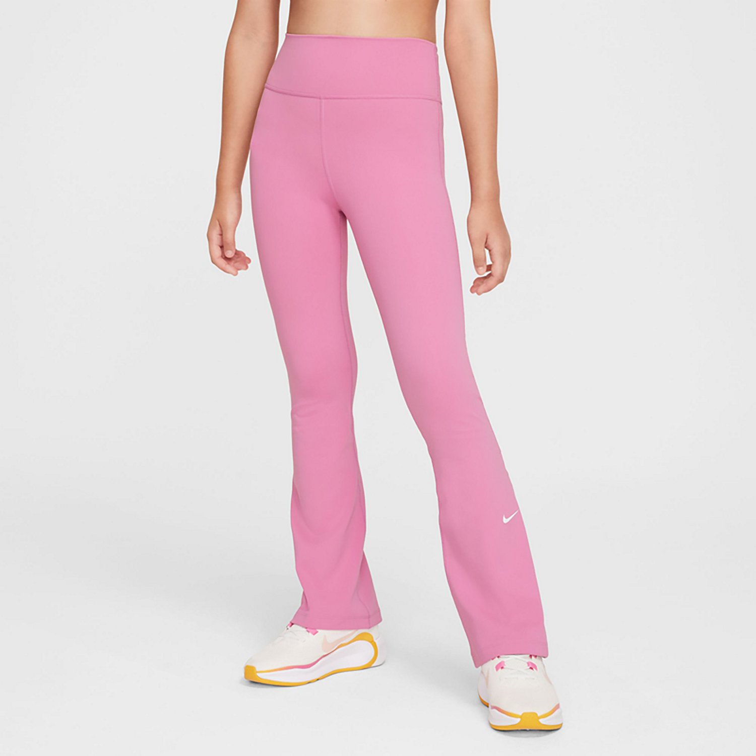 Stay comfortable while working out wearing the Nike Girls' Nike One Dri-FIT Flared Leggings. They are made of 80% polyester and 20% spandex. The Dri-FIT technology moves sweat away from your skin for quicker evaporation, helping you stay dry and comfortable, and their hidden pocket inside the back waistband provides storage for small essentials. The high-waisted design helps keep you covered as you bend and stretch.