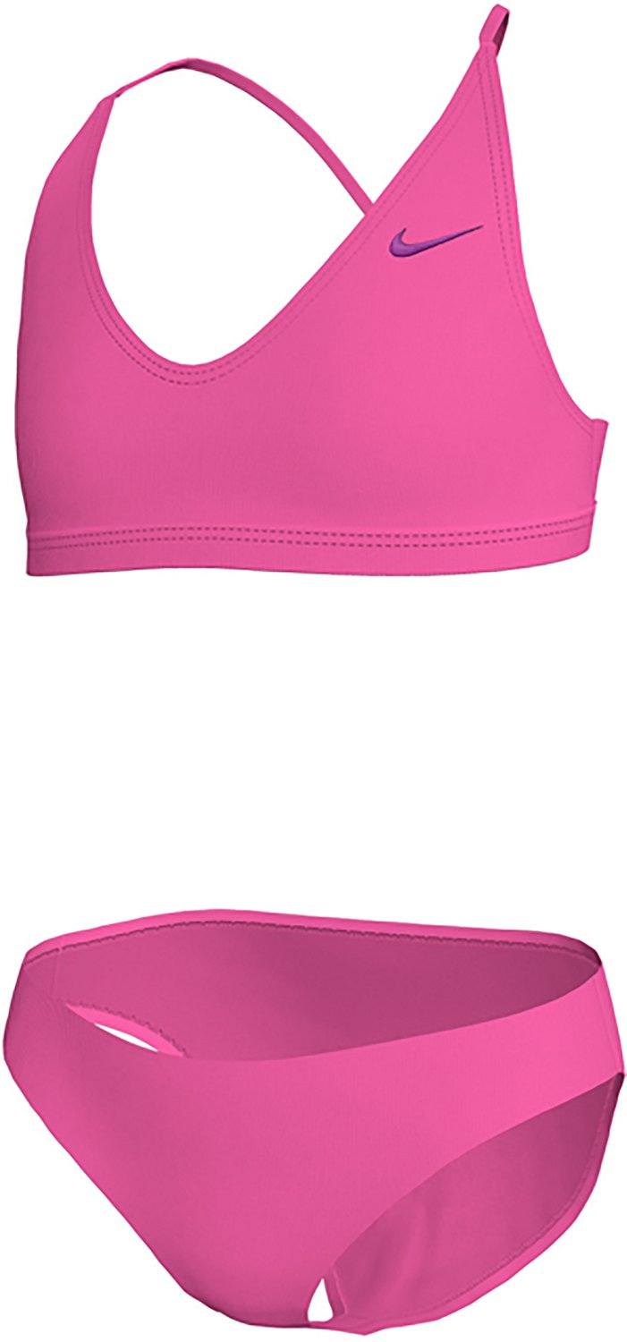 Splash around in the Nike Girls' Essential Lace Up Bikini 2-Piece Swimsuit Set. Their body is made of 80% nylon and 20% spandex. The liner is made of 100% polyester, and their fixed-lace design lets them move freely. The Swoosh on the left chest and on the center back of the bottom finishes off the design.