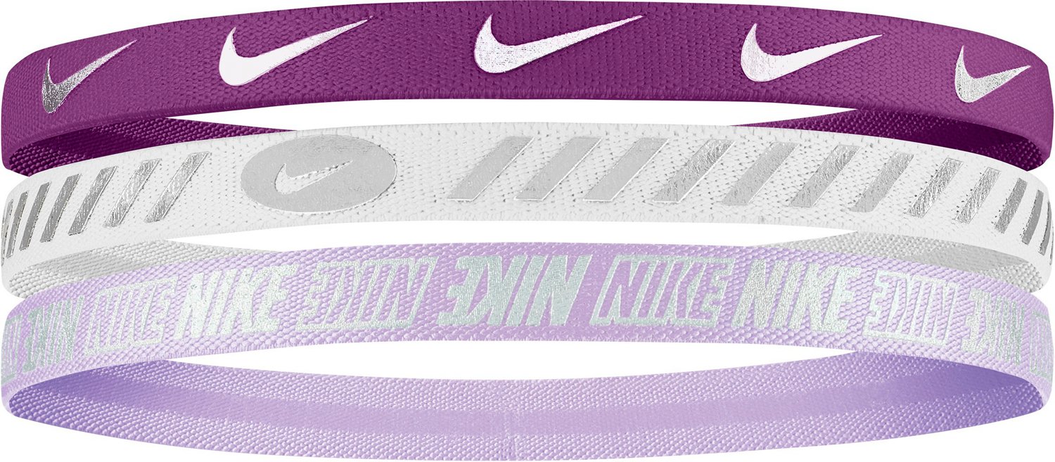 Pull back her hair for a day of play with the Nike Girls' Metallic Headband 3-Pack. These stretchy headbands feature grippy silicone strips, helping them stay in place while she's on the move. Metallic accents add style while showing her brand love.
