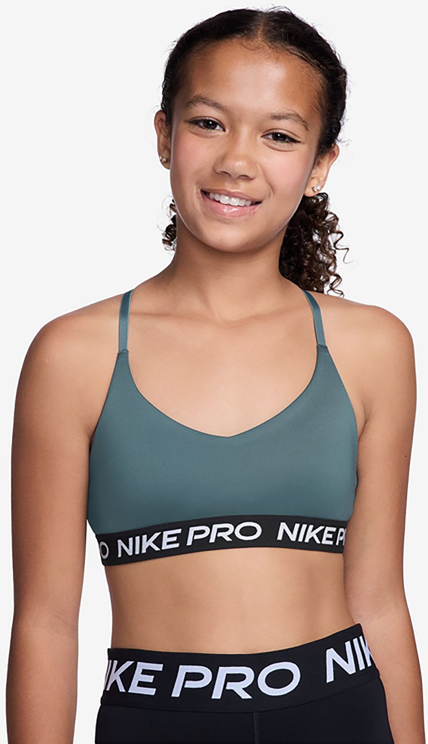 Work out in comfort wearing this Nike Girls' Pro Indy Low Support Sports Bra, featuring 2 removable polyurethane-polyester pads for enhanced support. The polyester, nylon and Spandex construction is moisture-wicking, so you stay cool and dry all session long. The V-neck collar and racerback design give your training ensemble stylish looks all your own.