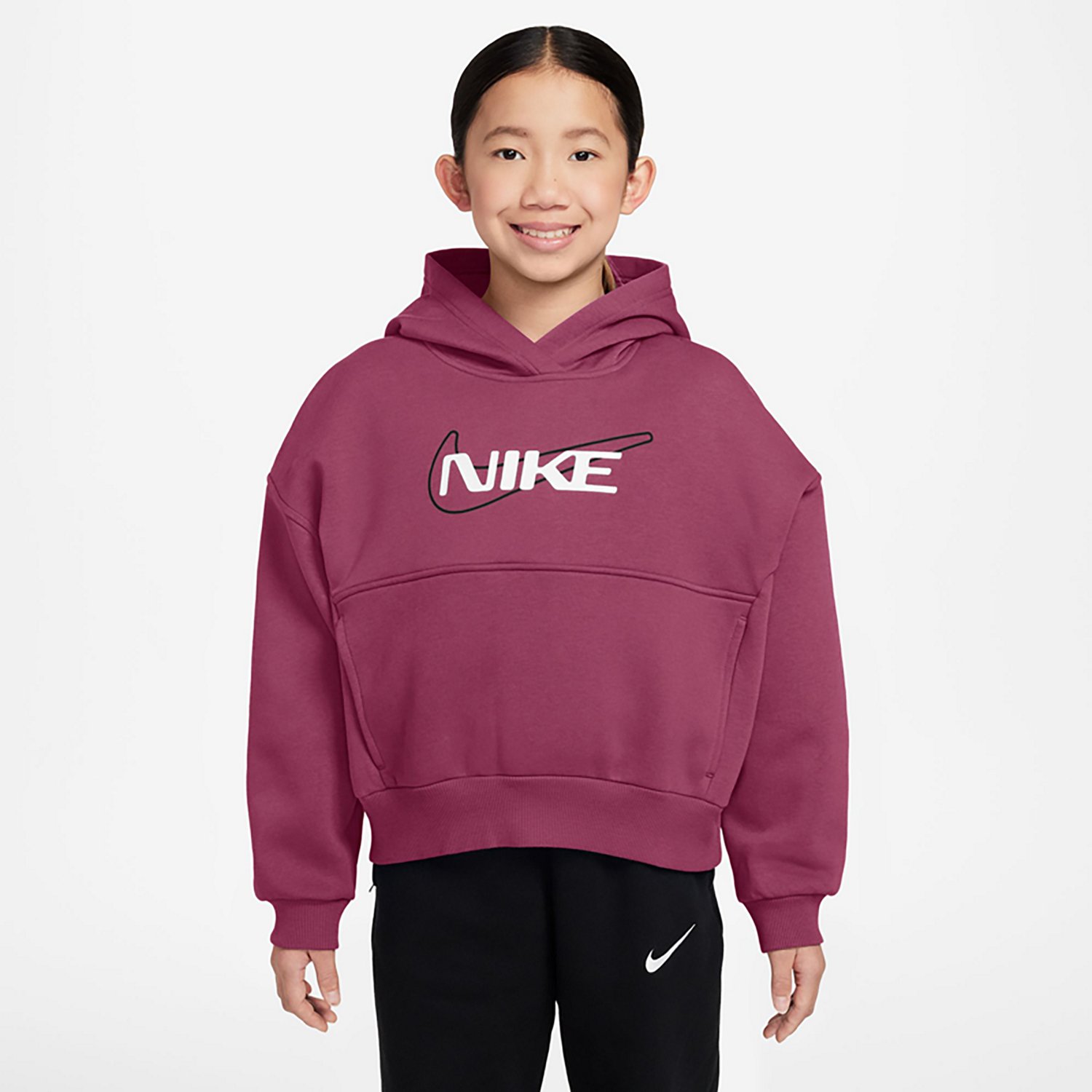 You can keep your style showing when you throw on the Nike Girls' Sportswear Club Fleece Boxy GX Star Hoodie on a cool day. This hoodie is made of 80% cotton and 20% polyester lightweight fleece to help you stay warm and comfortable, and the hood helps protect your head and hair from the elements.