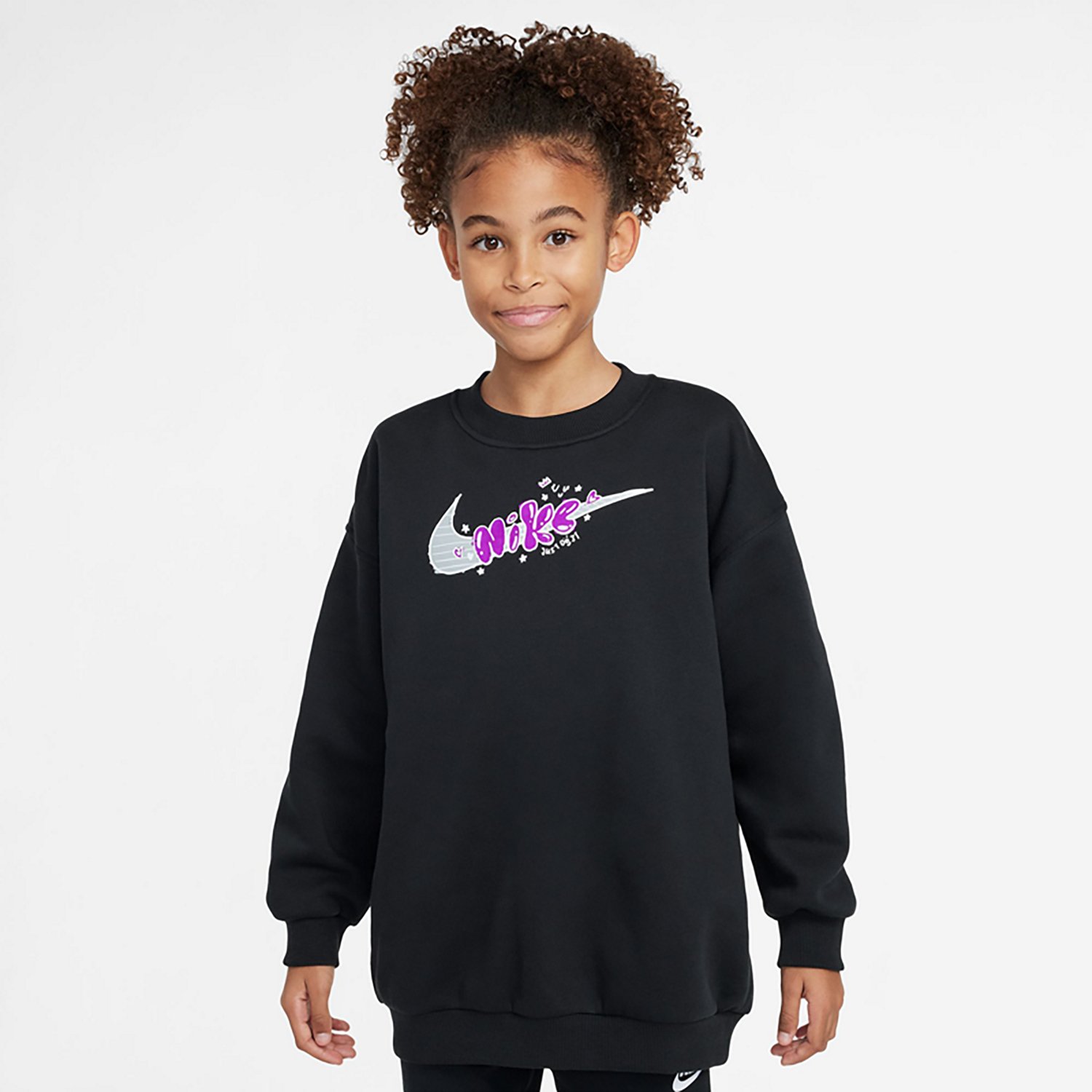 Relax in style with this Nike Girls' Sportswear Club Fleece Oversized Graphic Crew Pullover. It is made of 80% cotton and 20% polyester for comfort and durability, and the pullover features a cute, brand-based graphic design across the chest for simple style. The oversized fit makes comfort easy to enjoy.