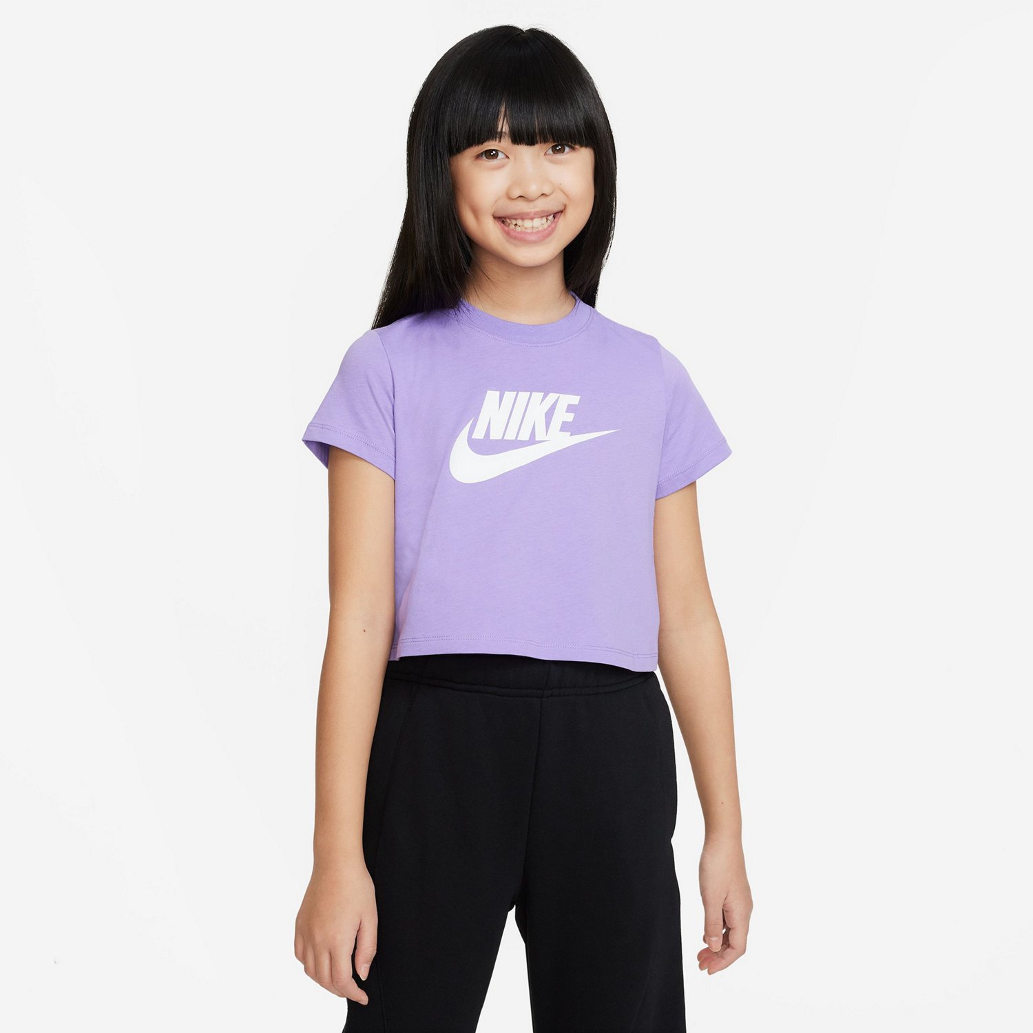 Stay comfortable on the move when you sport the Nike Girls' Sportswear Futura Crop T-shirt. The 100% cotton fabric offers softness and a lightweight fit, while the cropped length creates a trendy appearance.