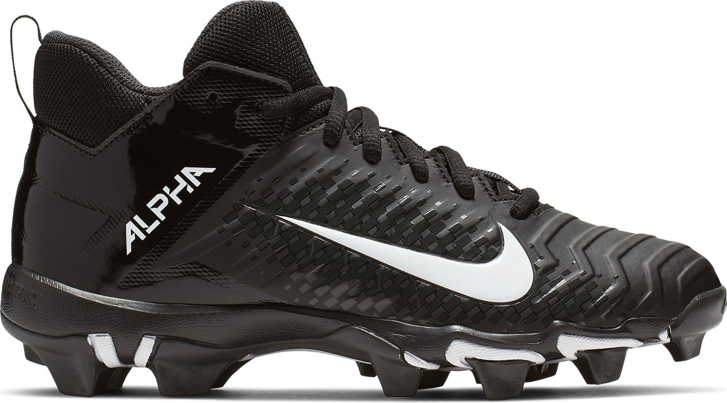 Find your way into the endzone with help from the Nike Kids' Alpha Menace Shark 2 Football Cleats. The synthetic leather and fabric construction offers stability, while the foam cushioning is lightweight and comfortable. The Nike™ FastFlex technology in the outsoles allows for wide-ranging motion, and the rubber tread delivers grip for bursts of speed. The abrasion-resistant molding provides durability.
