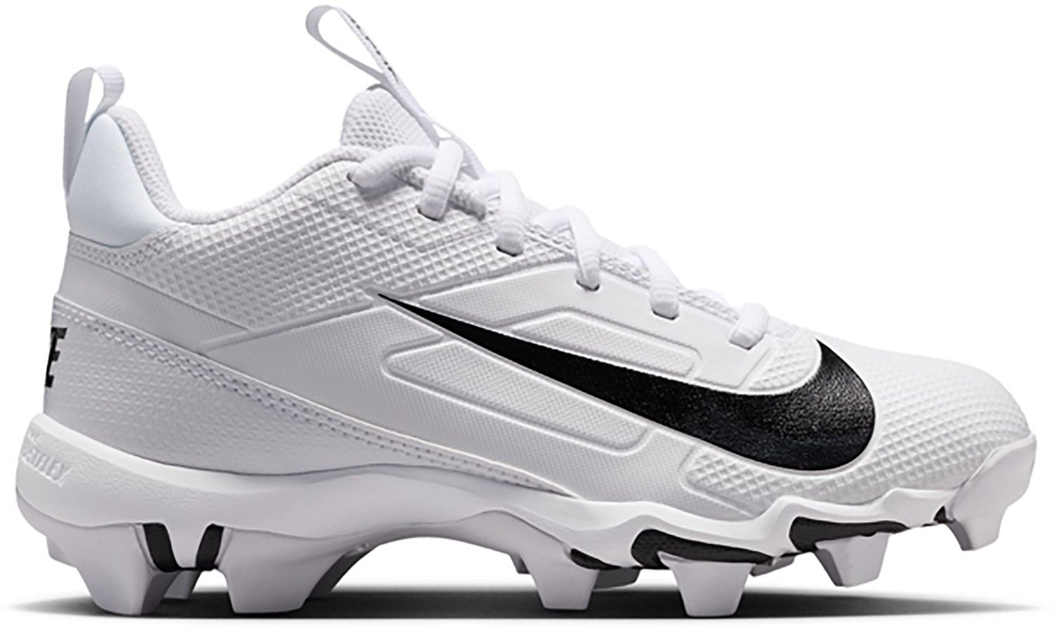 Show off your speed as you reach for the goal line by wearing the Nike Kids' Alpha Shark Football Cleats. The mesh and synthetic uppers offer breathability and durability, while the Fastflex technology with rubber studs provide flexibility and traction. The mesh collars and tongues ensure a comfortable feel, and the lace closures deliver a snug fit.