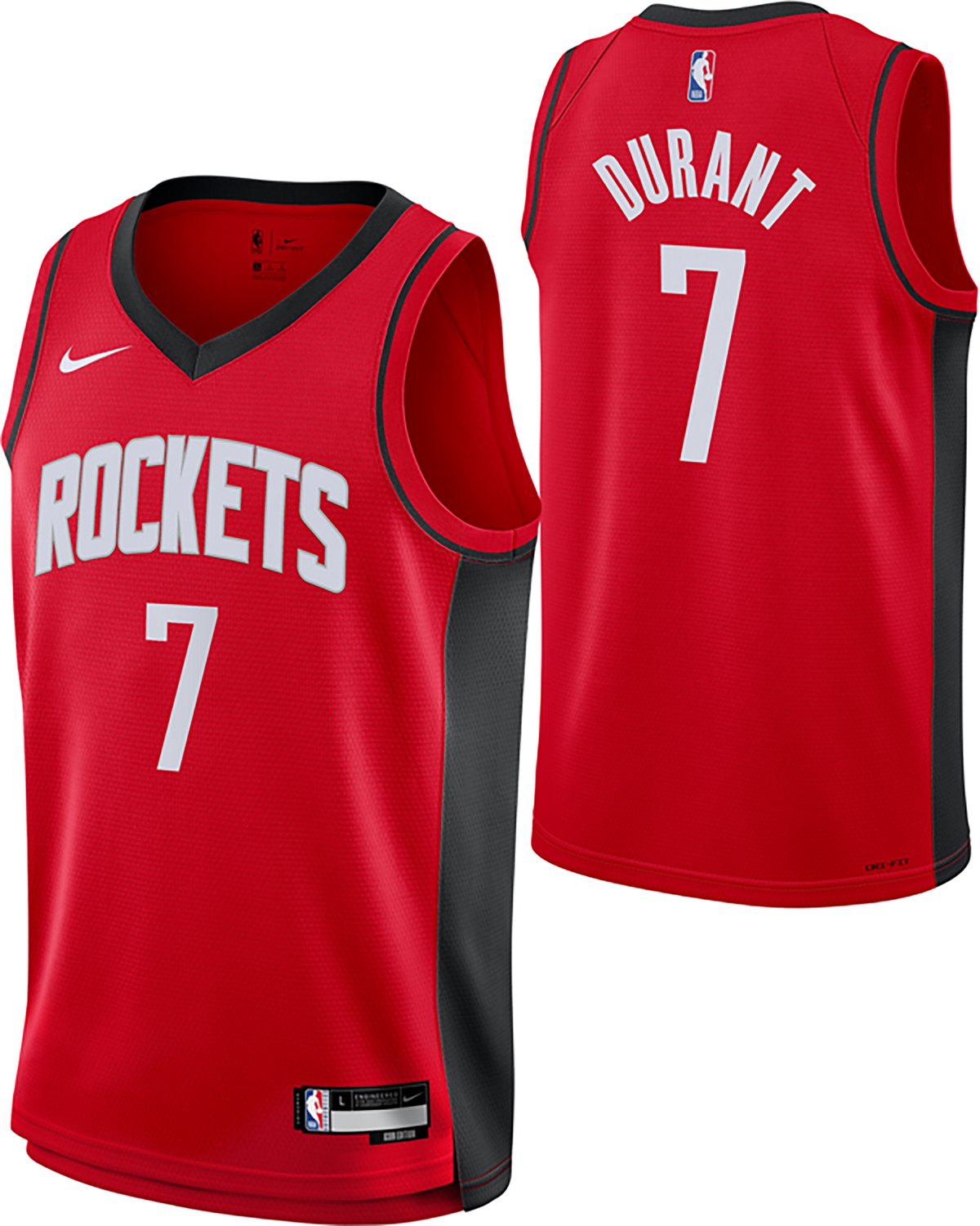 Root for your favorite team when you wear the Nike Kids' Houston Rockets Kevin Durant Icon Swingman Name and Number Jersey. It is made of 100% polyester. The V-neckline provides an authentic jersey look, and its Houston Rockets graphics show off your team spirit. Kevin Durant's name and number proudly display your favorite player.