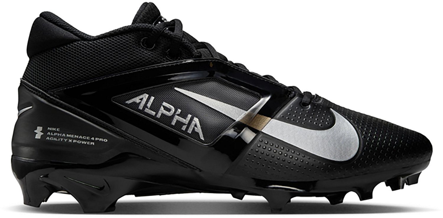 Put the moves on the competition with the Nike Men's Alpha Menace 4 Pro Football Cleats. The molded plastic quarter cages in the uppers provide stability, while the wide stud placement with edge traction enables sharp cuts and lateral stability. The carbon fiber plates add stiffness to the heels, stability to the midfoot and response to the forefoot, and the X-Frame on the bottoms deliver additional stability during hard braking and quick cuts.