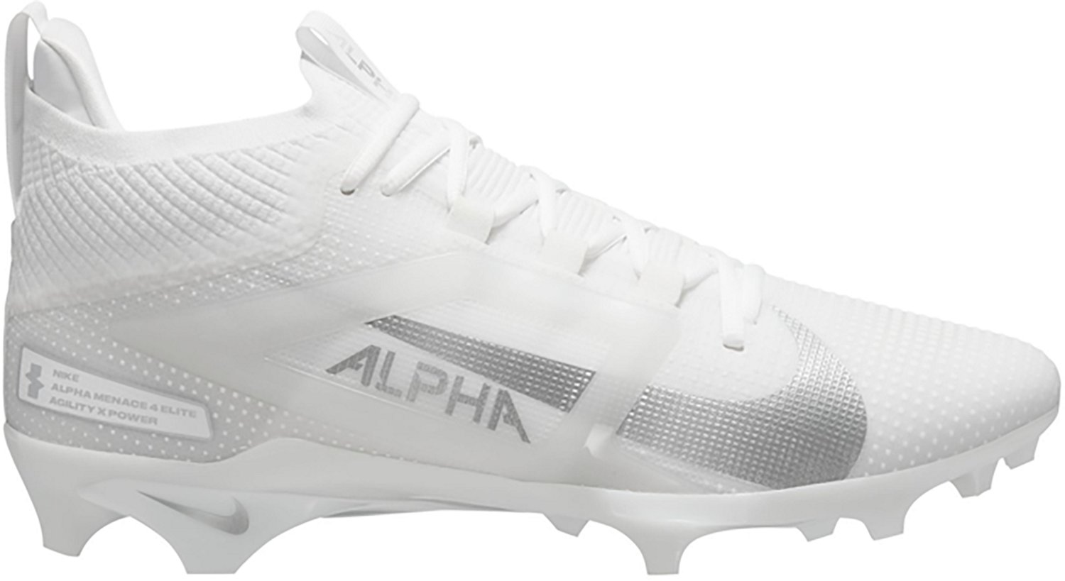 Hit the field with confidence wearing the Nike Men's Alpha Menace Elite Football Cleats. The synthetic leather uppers withstand wear and tear, and the outsoles with a wider stud placement help you maintain your grip on the field. The plastic side cages offer great stability, and the X-Frame bottoms promote flexibility to help with your hard braking and quick cuts.