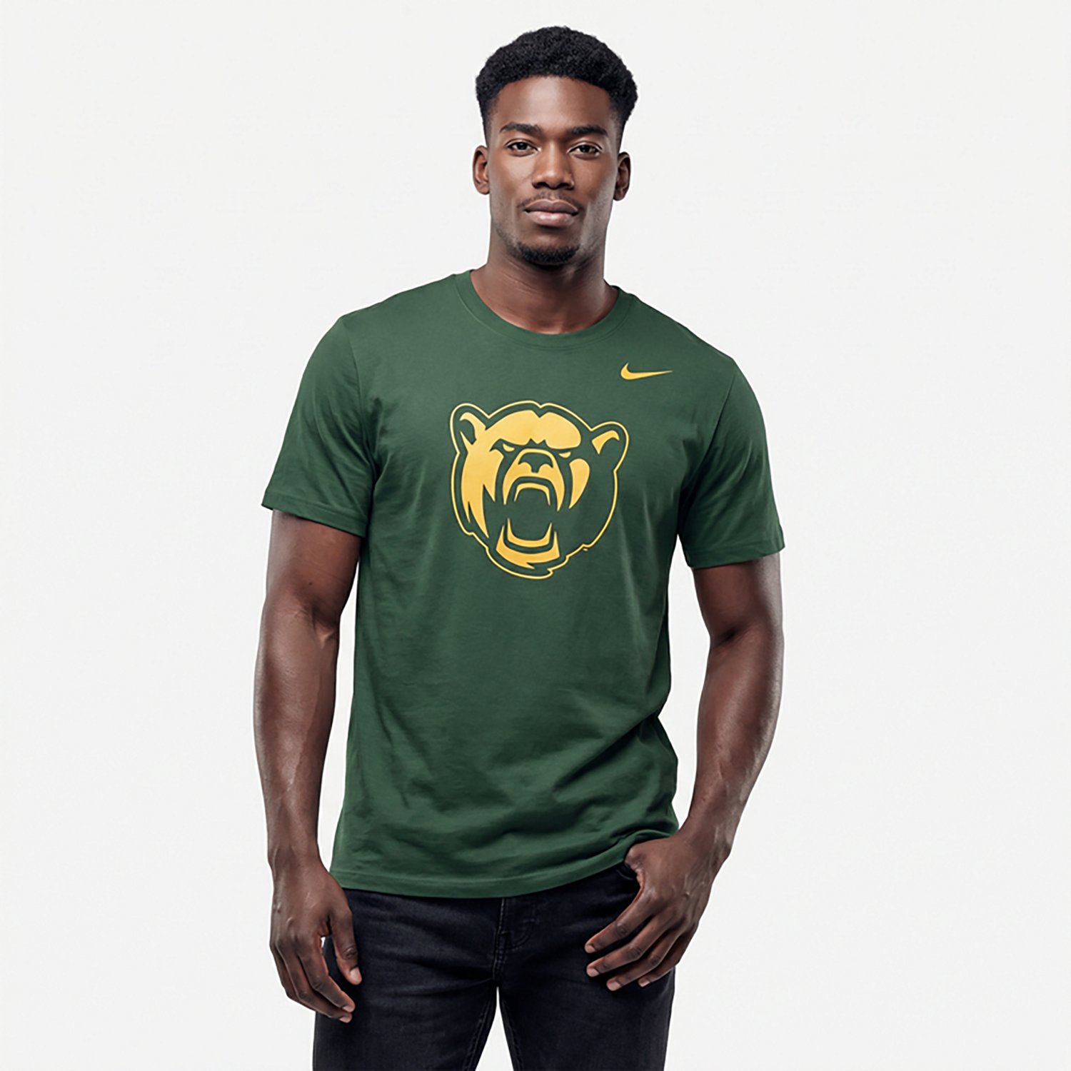 Make sure it's clear which school you root for by throwing on the Nike Men's Baylor Secondary Logo Core T-shirt. This T-shirt is made of 100% cotton with short sleeves and a crew neck for casual comfort, and the school-based graphic puts your fandom front and center for all to see.
