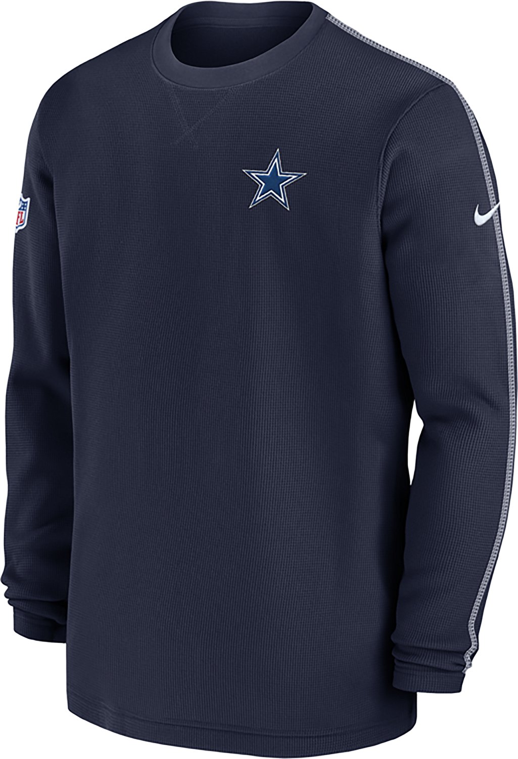 Channel your inner coach with the Nike Men's Dallas Cowboys Coach Long Sleeve T-shirt. This breathable t-shirt is made of warm polyester and cotton for a lightweight and comfortable fit. The contrast stitching down the sleeves and Cowboys logo creates a sporty look that displays your fandom.