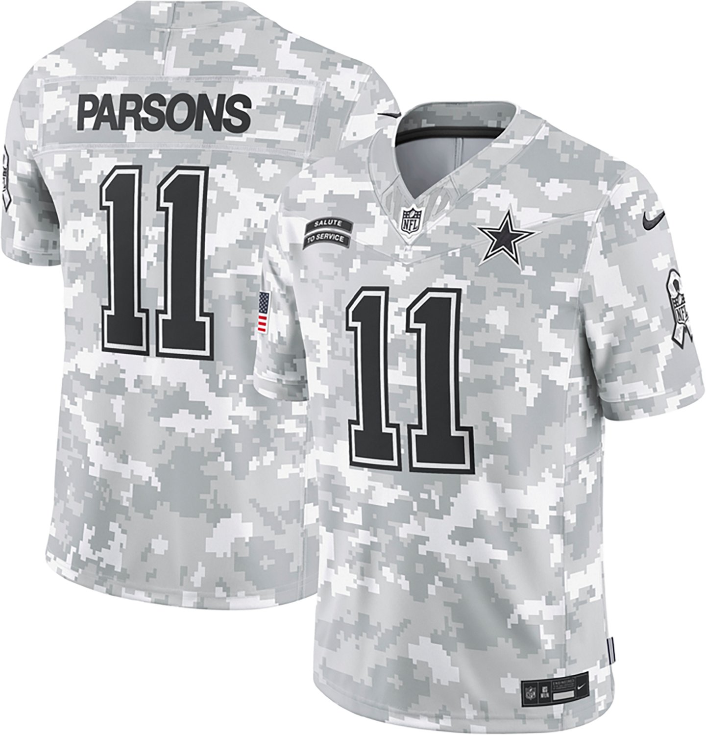 Support your team and country with this Nike Men's Dallas Cowboys Micah Parsons Salute to Service Limited Jersey. It has a camouflage pattern for military-inspired style, and the jersey features an American flag and a Solute to Service ribbon on the sleeves to display your patriotism. Features Micah Parsons' name and number on the back.
