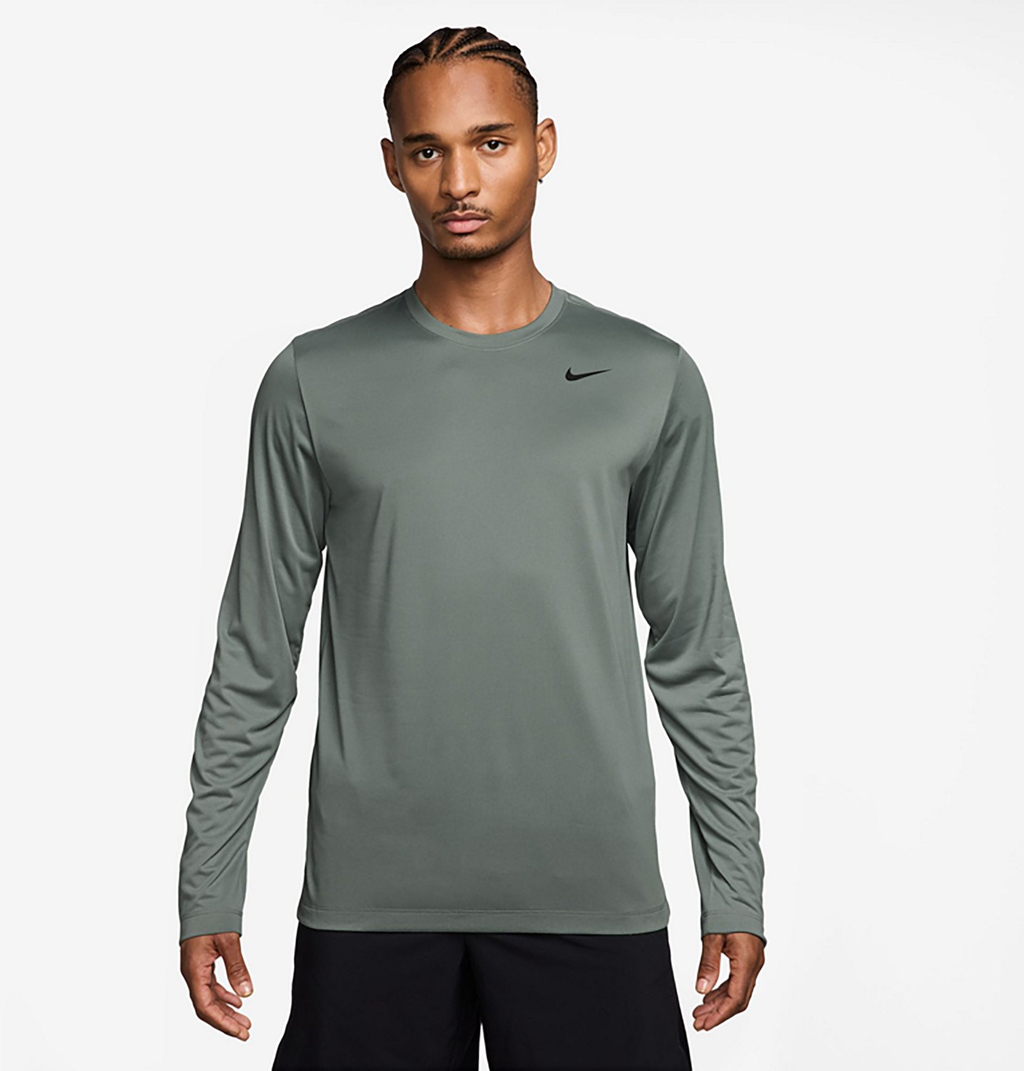 Workout in comfort wearing the Nike Men's Dri-FIT Legend Long Sleeve Fitness Top. This top is made from polyester jersey fabric that feels soft and smooth. The Dri-FIT technology moves sweat away from your skin for quicker evaporation so you can stay dry.