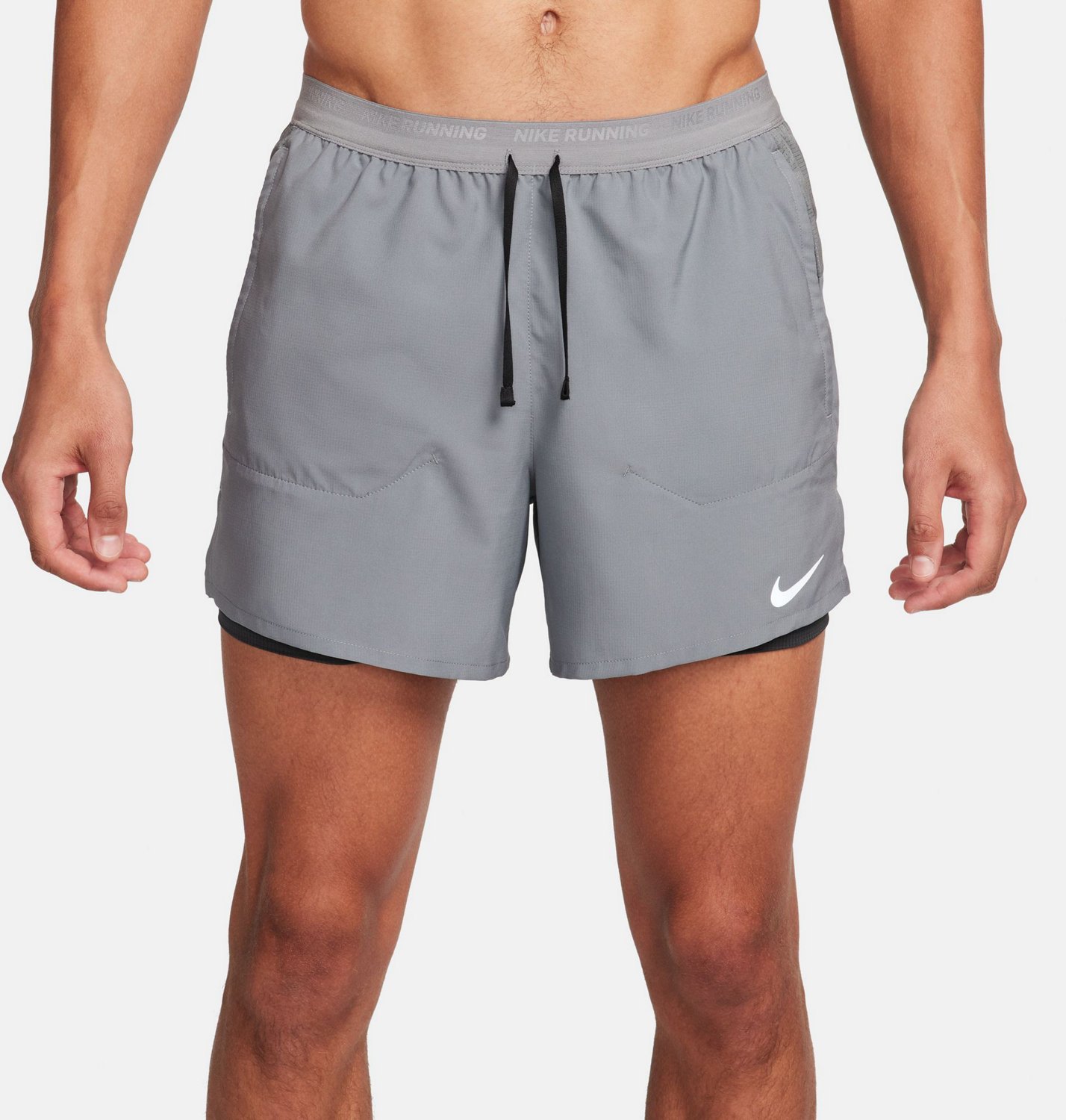 Reach your running goals in the Nike Men's Dri-FIT Stride 2 in 1 Shorts 5 in. The 100% polyester body construction offers a long-lasting feel, and the Dri-FIT technology helps keep you dry. The side pockets provide room to conceal items, and the narrow waistband with drawstring delivers a custom fit.
