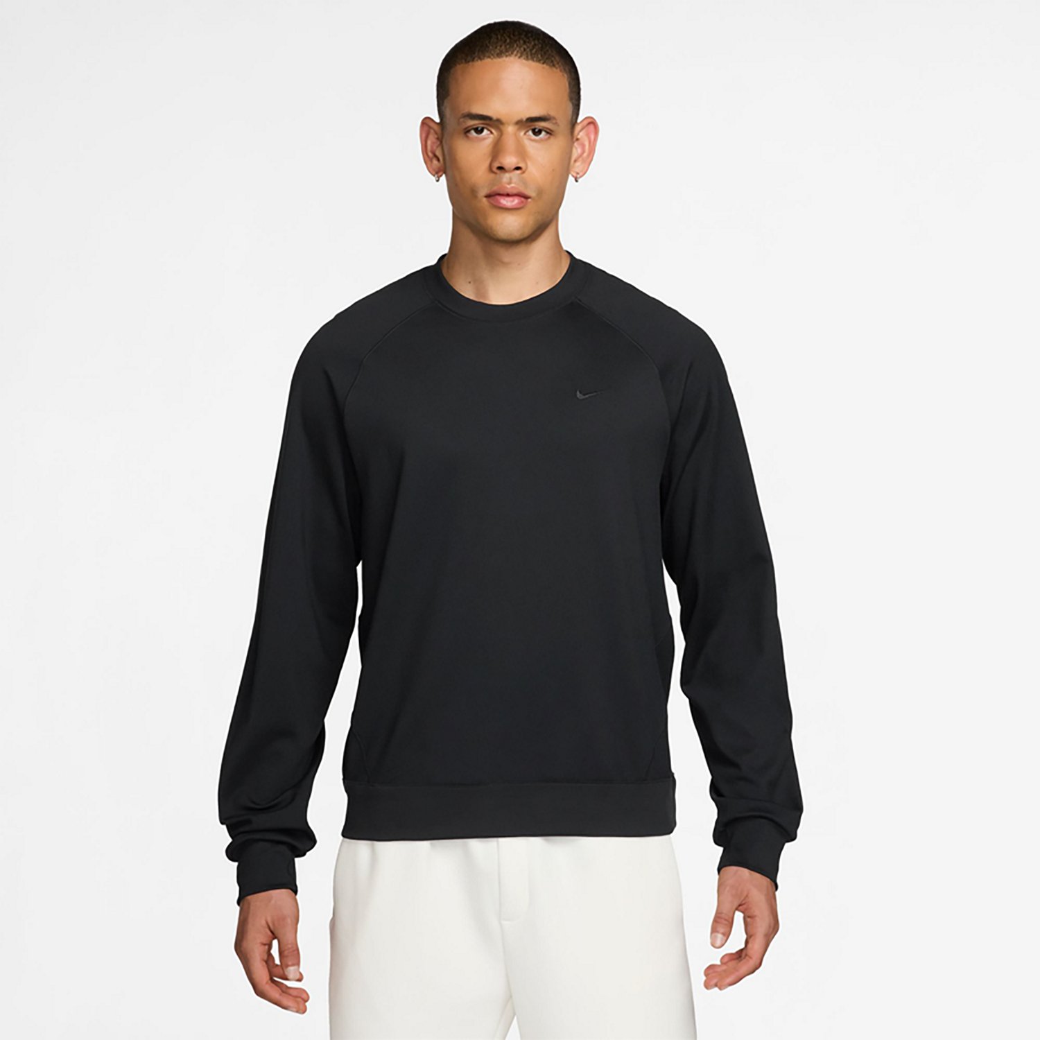 Look your best when you wear the Nike Men's Dri-FIT UV Primary Knit Long Sleeve Crewneck Sweatshirt. It is made of 100% polyester. The Dri-FIT technology wicks away sweat and quickly dries, and it provides UVA and UVB protection from the sun. The modified raglan construction creates a comfortable fit.