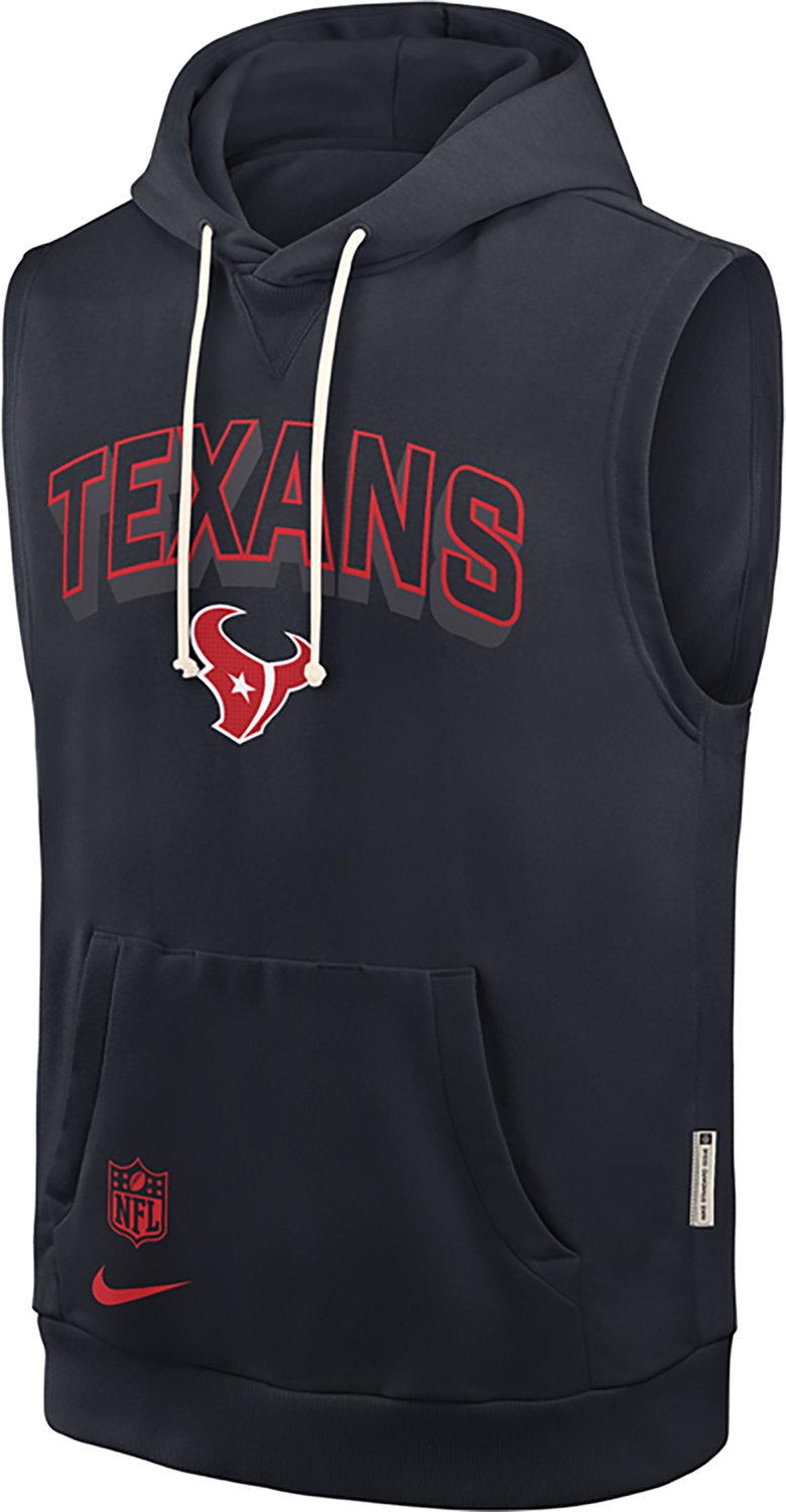 Blend comfort and style with this Nike Men's Houston Texans Dri-FIT Fleece Sleeveless Hoodie. It features Dri-FIT technology to help keep you dry and comfortable, and the sweatshirt is hooded with a drawstring for adjustable coverage. Features a team graphic design on the chest.