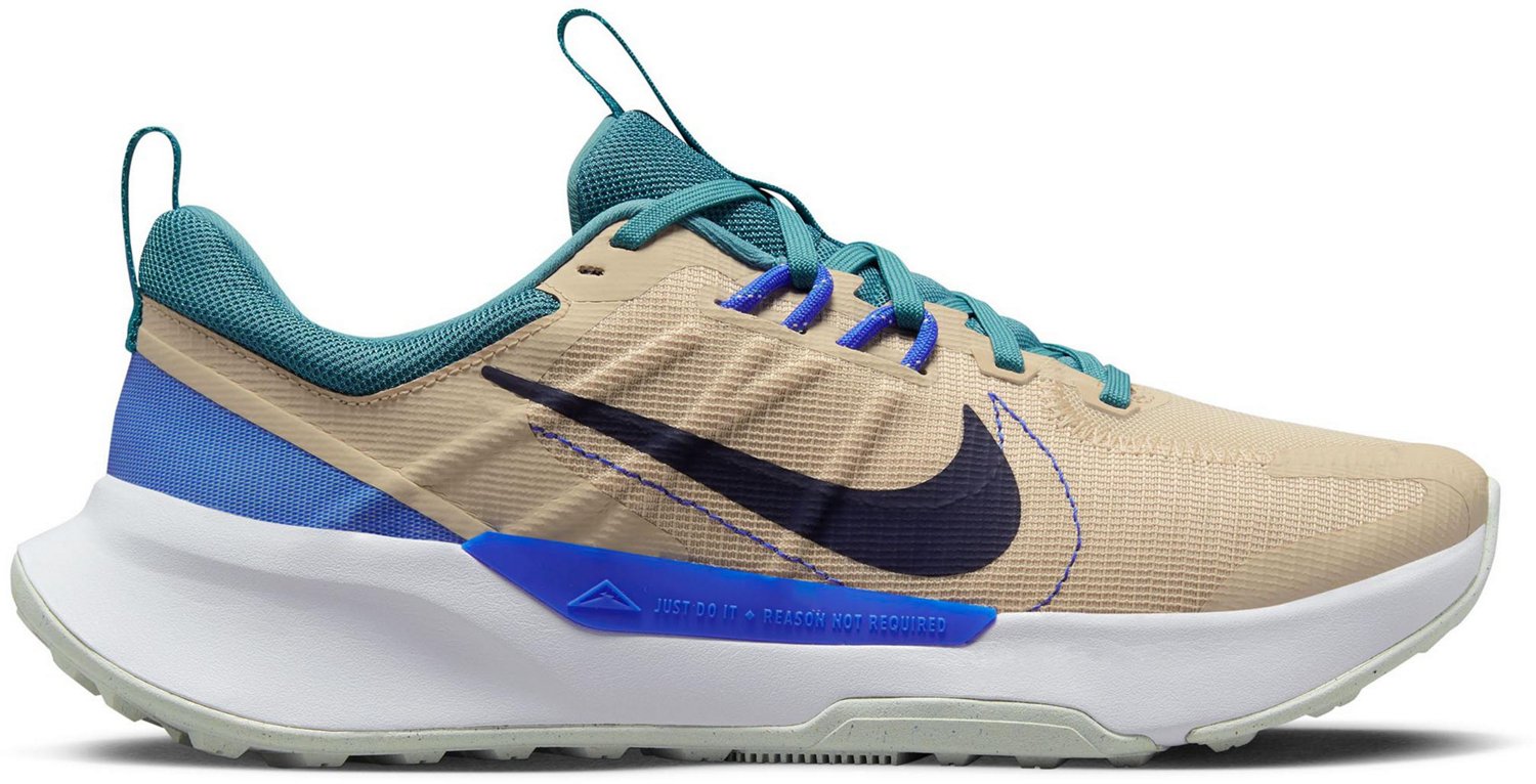 Experience confident trail running in the Nike Men's Juniper Trail 2 Rugged Grip Trail Running Shoes. These men's athletic shoes offer comfort and durability with mesh, synthetic leather, and textile uppers. Flywire cables integrate into the lace-up closure for a secure fit. The design includes rubber outsoles with tapered lugs for reliable traction on tough terrain and foam midsoles providing extra cushioning and support.