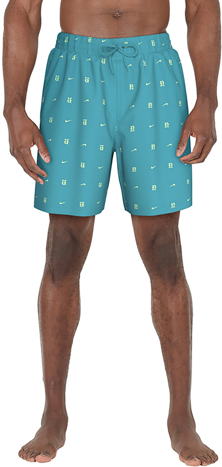 Enjoy the water in style with these Nike Men's Luxe Letter Volley Shorts 7 in. They are made of 100% recycled nylon Taslan for comfort and durability, and they feature an all over Swoosh logo print to deliver a fashionable look.