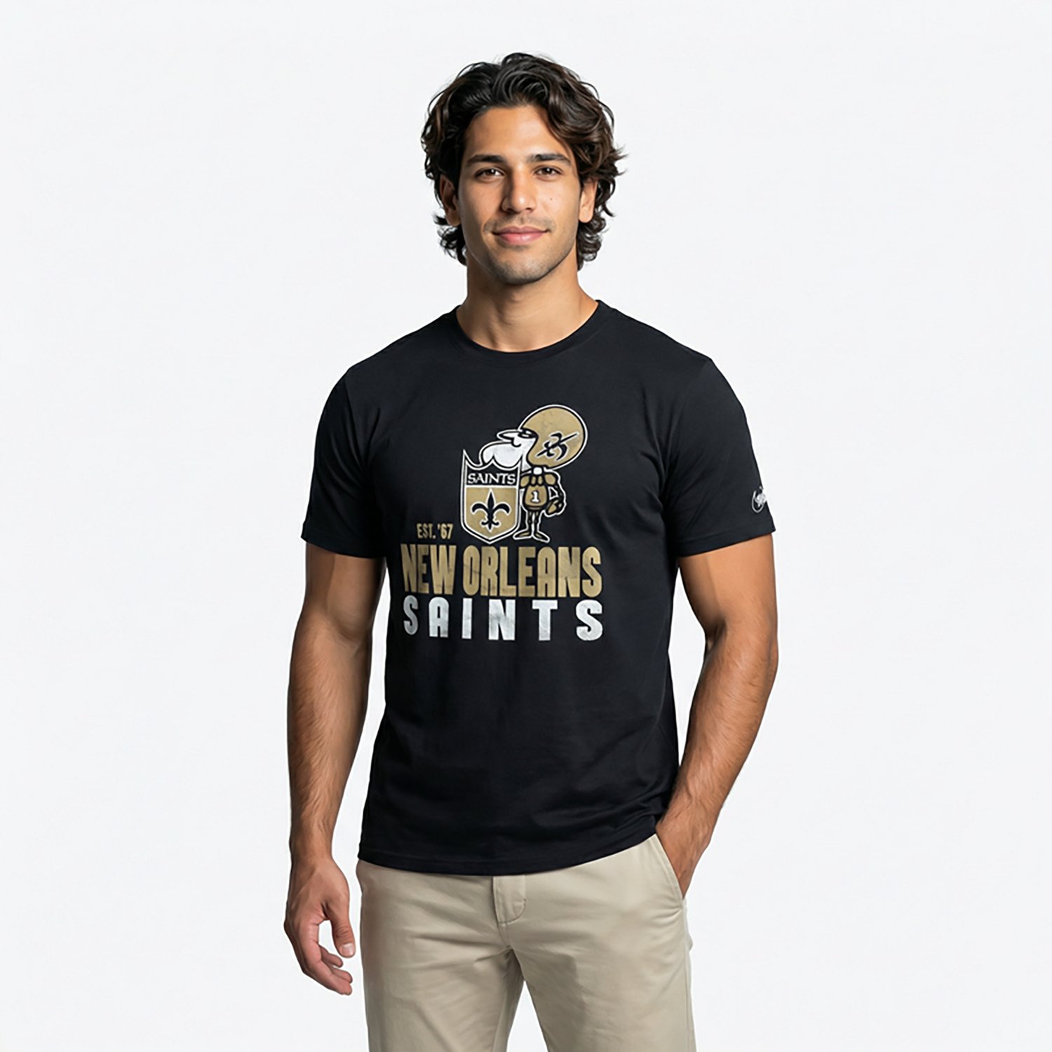 Put your game face on with the Nike Men's New Orleans Saints Helmet Essential Graphic T-shirt. The cotton plain jersey fabric provides a comfortable feel, while the graphic design shows off your Saints pride.