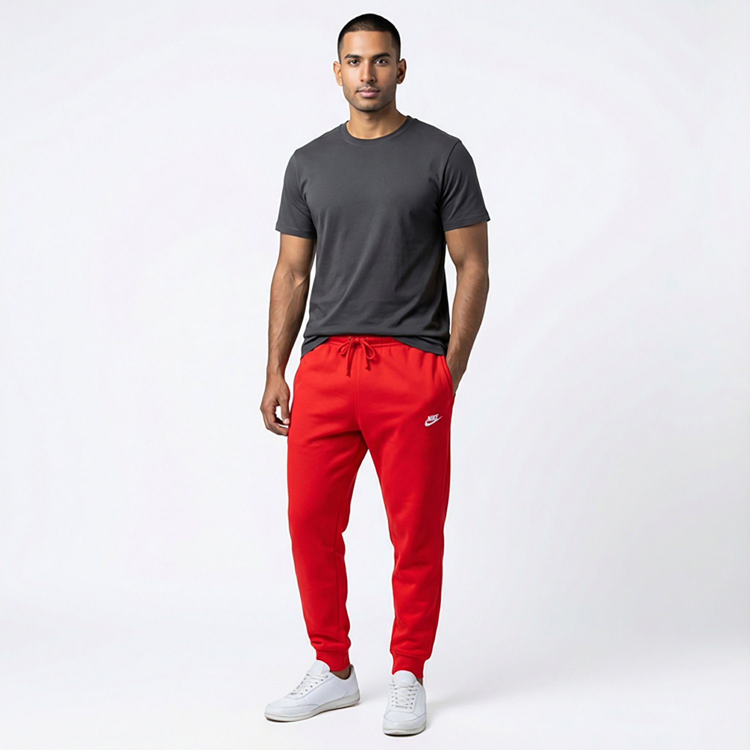 Stay casual in the Nike Men's Nike Club Joggers. Their body is made of 80% cotton and 20% polyester. The snap closure back welt pocket and hand pockets fit most phones, and their slightly tapered legs are finished with 3-inch ribbed cuffs. The standard fit feels relaxed through the seat and thighs.