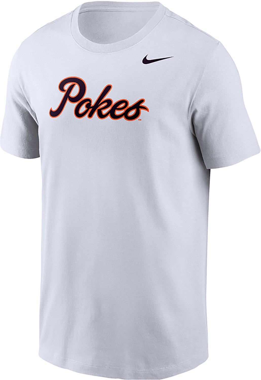 Make sure it's clear which school you root for by throwing on the Nike Men's Oklahoma State Script Pokes T-shirt. This T-shirt is made of 100% cotton with short sleeves and a crew neck for casual comfort, and the school-based graphic puts your fandom front and center for all to see.