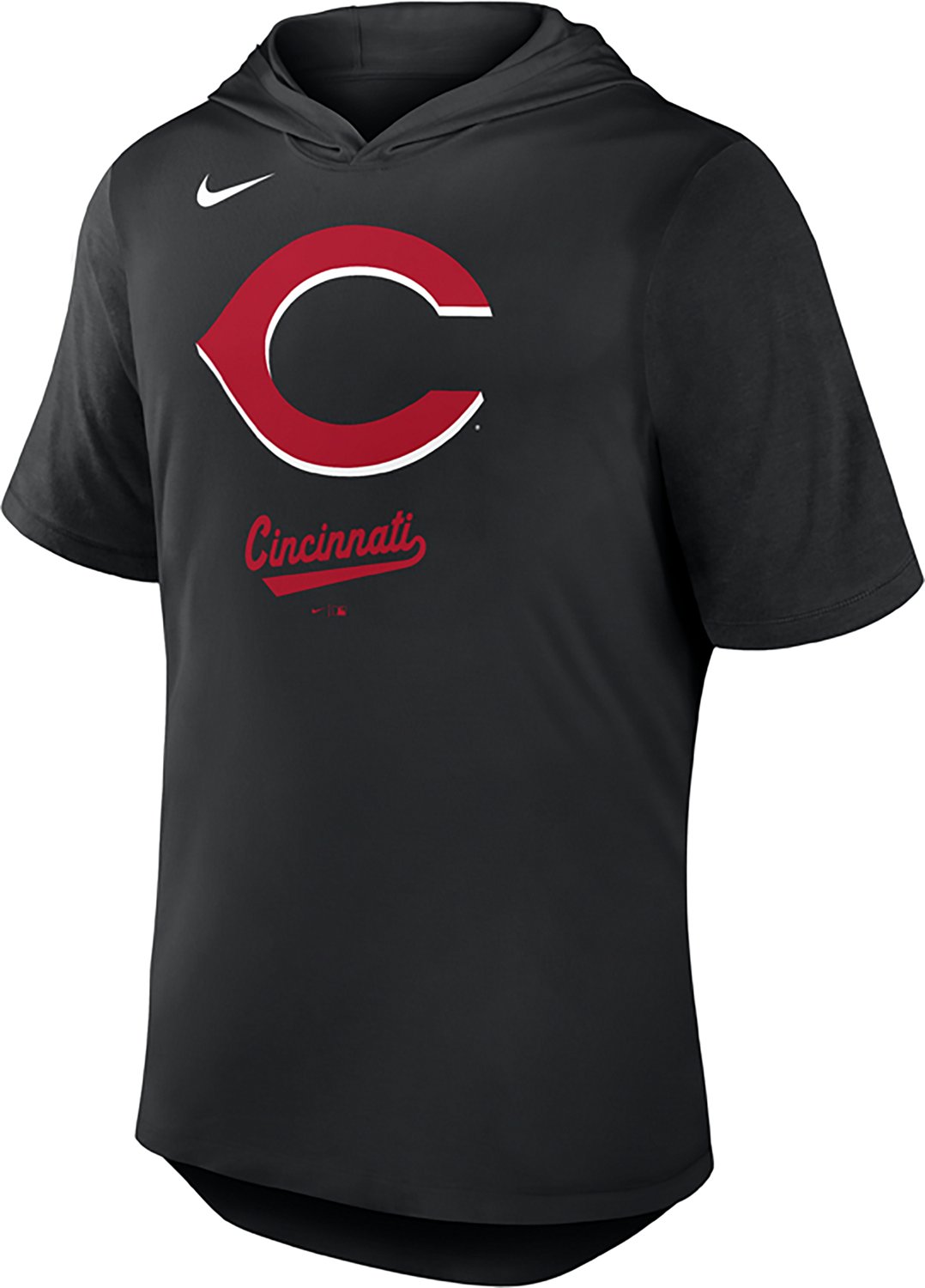 Show your Cincinnati Reds pride in laid-back style with the Nike Men's Reds MLB Logo Short Sleeve Hoodie. This unique top combines the casual comfort of a hoodie with the lightness of a short-sleeve tee, making it perfect for milder game days or relaxed everyday wear. It features the iconic Cincinnati Reds MLB logo prominently displayed, letting everyone know which team you support. Crafted from soft, comfortable fabric, this hoodie includes a functional hood and a relaxed fit for ultimate comfort as you cheer on the Reds.