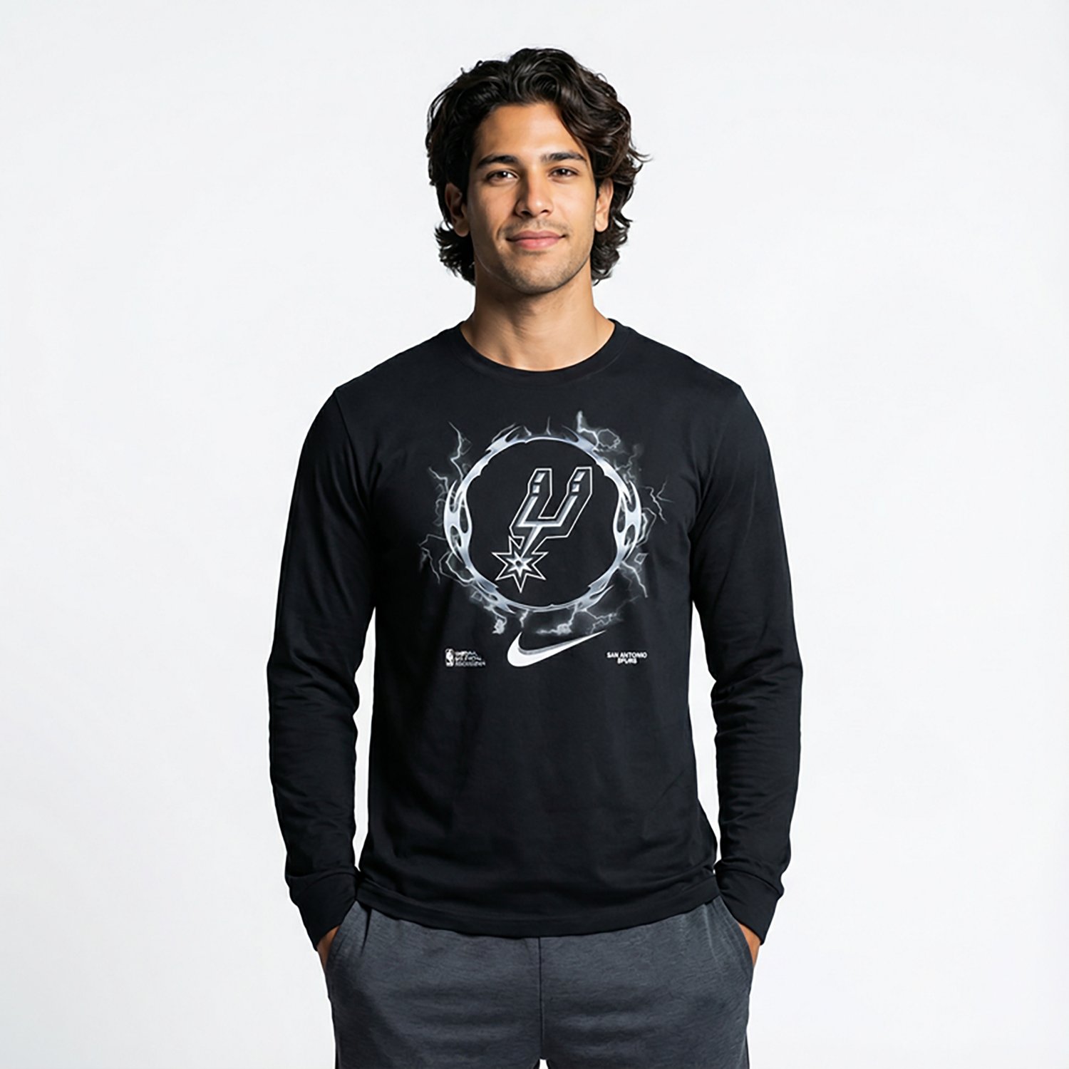 Show your support with the Nike Men's San Antonio Spurs Off-Court Max 90 Long Sleeve T-shirt. The cotton material is soft and breathable, and the San Antonio Spurs graphics are bold and stylish.