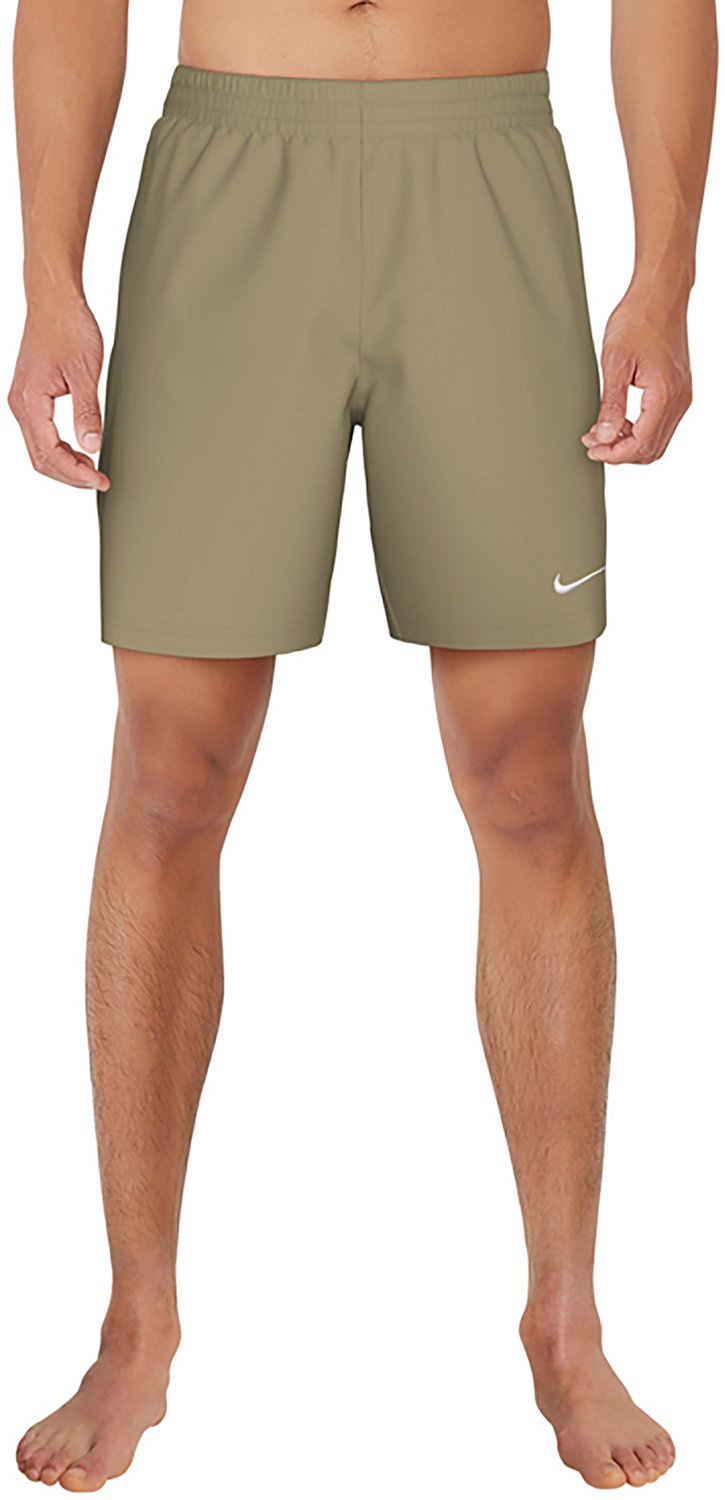 Stay stylish and relaxed at the beach or pool with these Nike Men's Solid Essential Volley Shorts 7 in. The body is made of 100% polyester for durability, and they are water-resistant for activities in the water.
